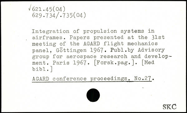 Integration of propulsion systems in airframes. Papers presented at the 31st meeting of the AGARD flight mechanics panel, Gottingen 1967.