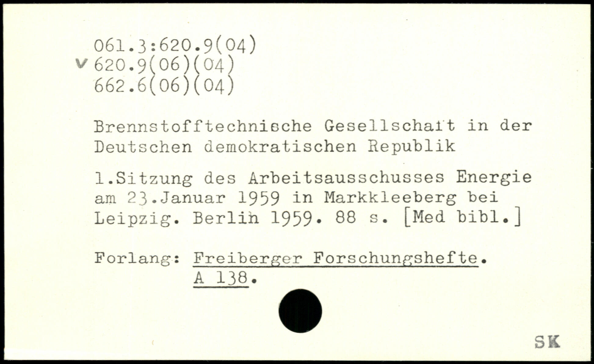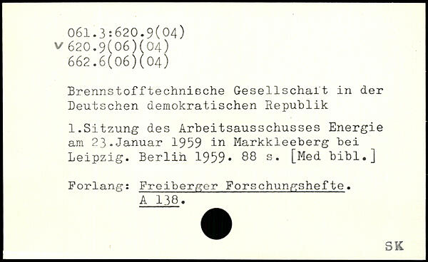 Brennstofftechnische Gesellschaft in der Deutschen demokratischen Republik 1.Sitzung des Arbeitsausschusses Energie i am 23.Januar 1959 in Markkleeberg bei Leipzig.