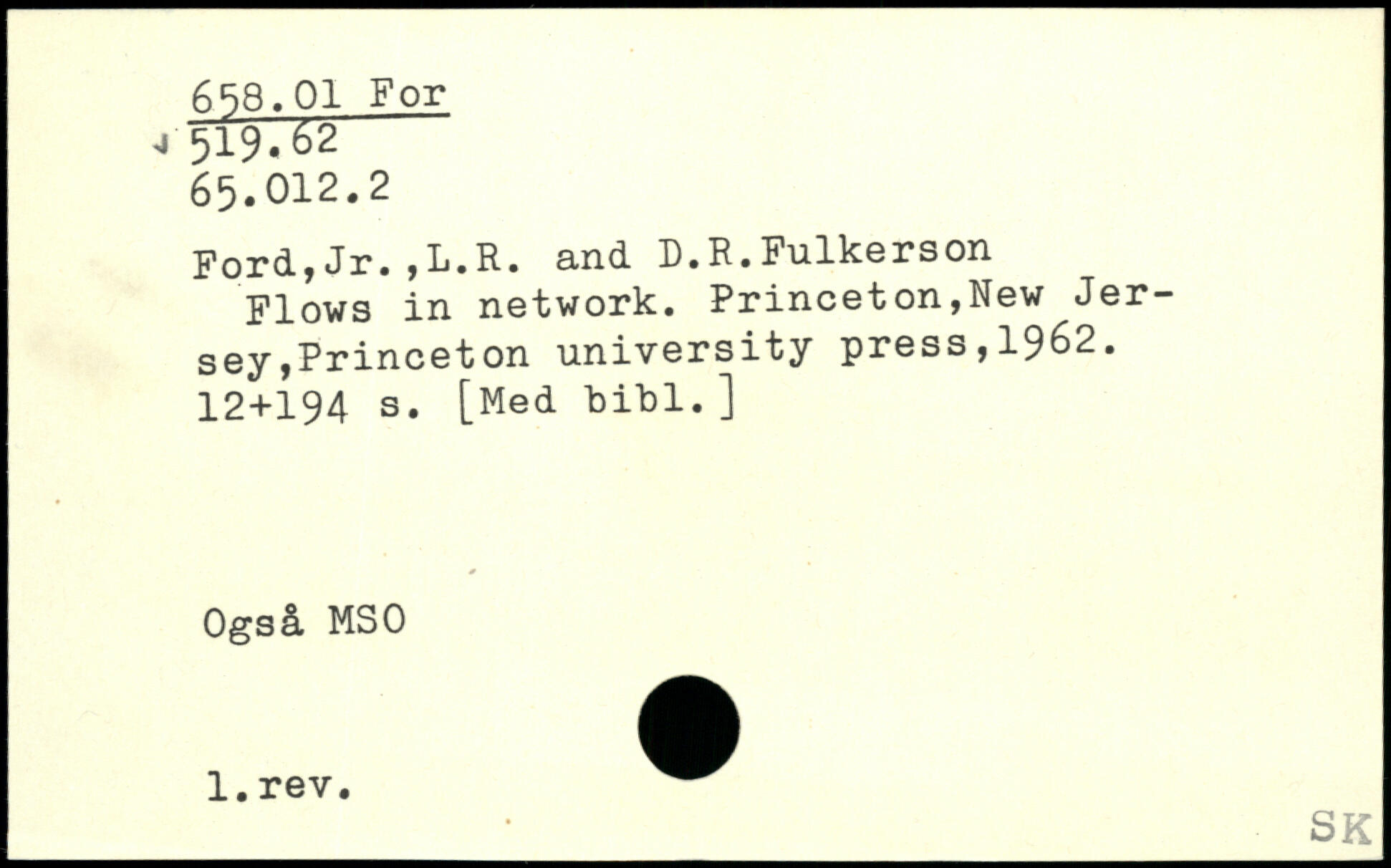 Ford,Jr.,L.R. and D.R.Fulkerson Flows in network. Princeton,New Jersey ,Princeton university press,19^2.