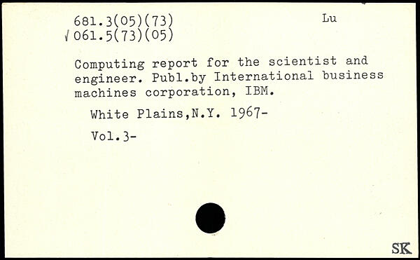 Computing report for the scientist and engineer. Pnbl.by International business machines corporation, IBM. White Plains,N.Y. 1967-