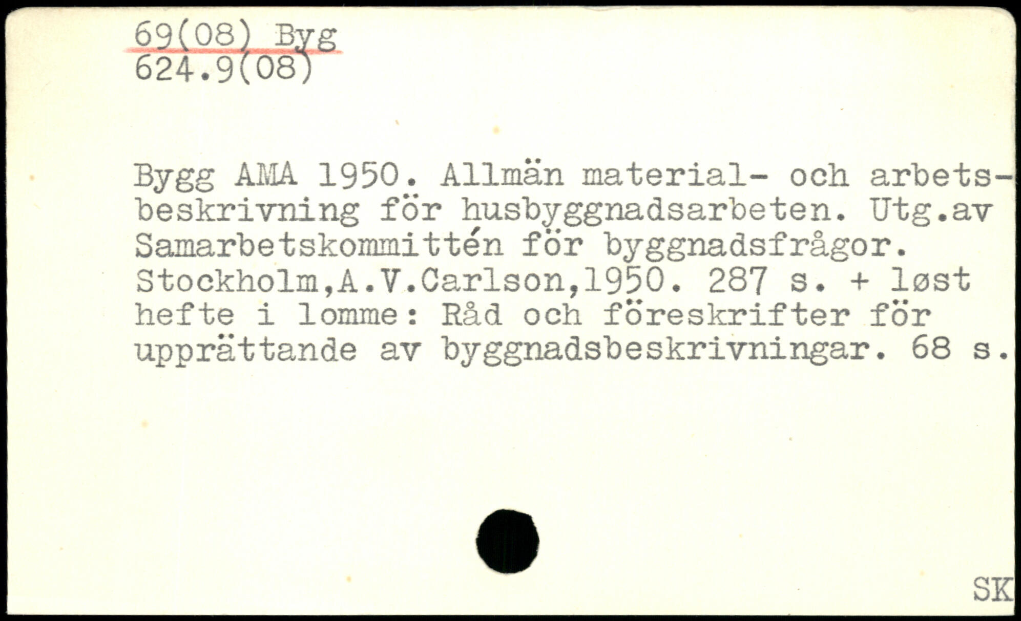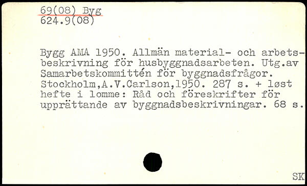 Bygg AMA 1950. Allmän material- och arbetsbeskrivning för husbyggnadsarbeten. Utg.av Samarbetskommittén för byggnadsfrågor. Stockholm,A.V.Carlson,1950.