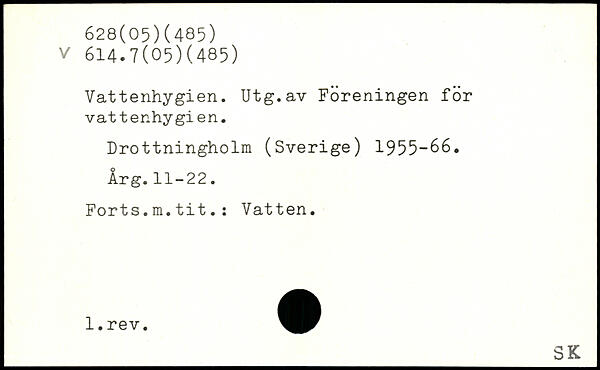 Vattenhygien. Utg.av Föreningen för vattenhygien. Drottningholm (Sverige) 1955-66. Årg.11-22. Forts.m.tit.: Vatten.