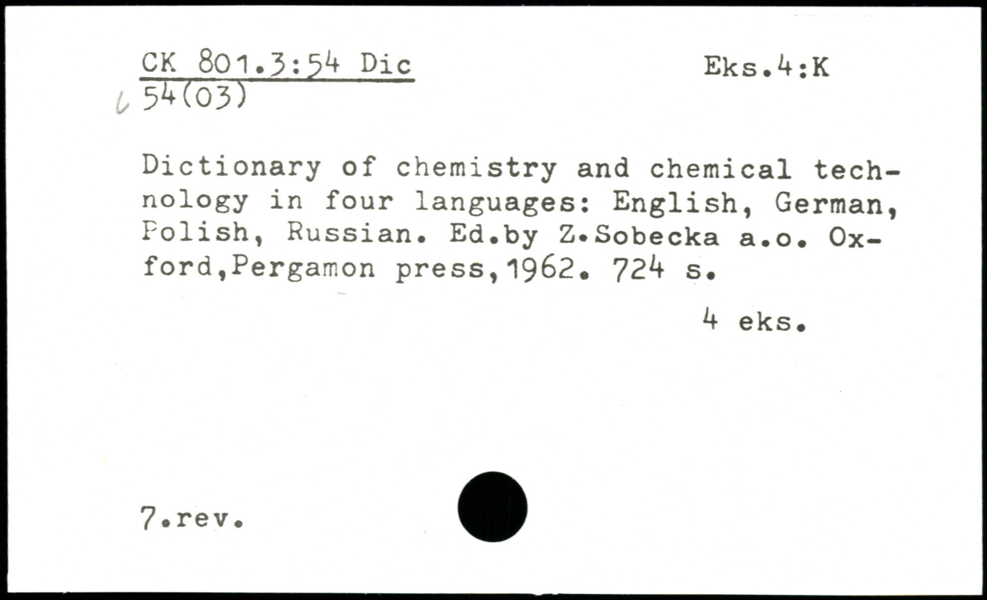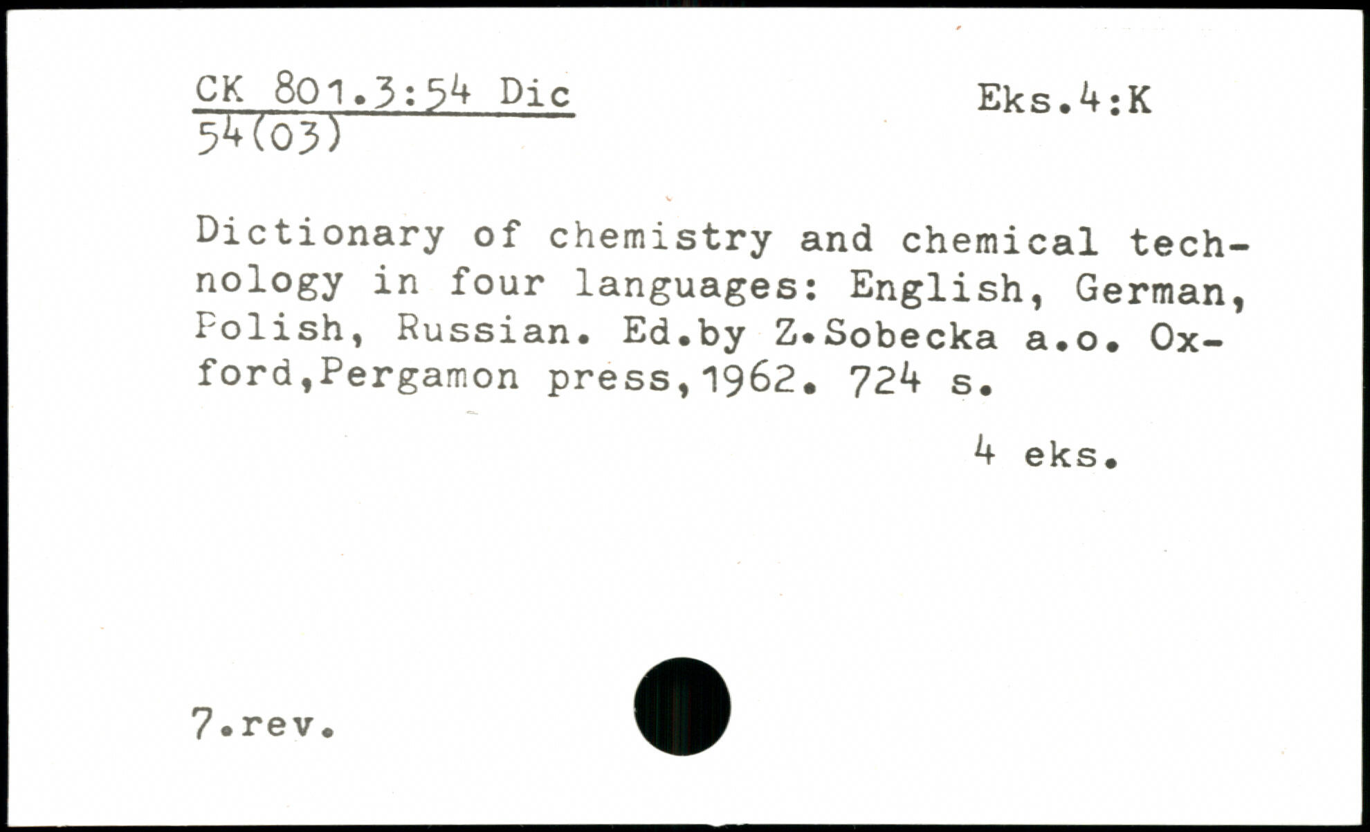 Dictionary of chemistry and chemical technology in four languages: English, German, Polish, Russian. Ed.by Z.Sobecka a.o.