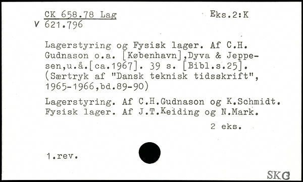 Lagerstyring og Fysisk lager. Af C.H. Gudnason o.a. [København],Dyva & Jeppe- sen,u.å.[ca.1967].