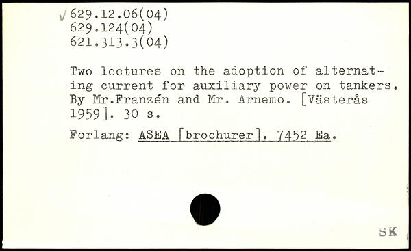 Two lectures on the adoption of alternating current for auxiliary power on tankers. By Mr.Franzén and Mr. Arnemo. [Västerås 1959].