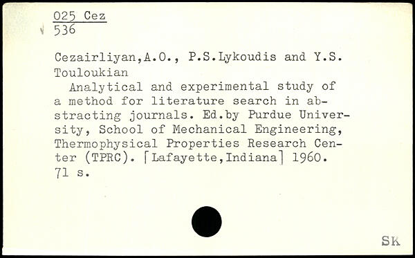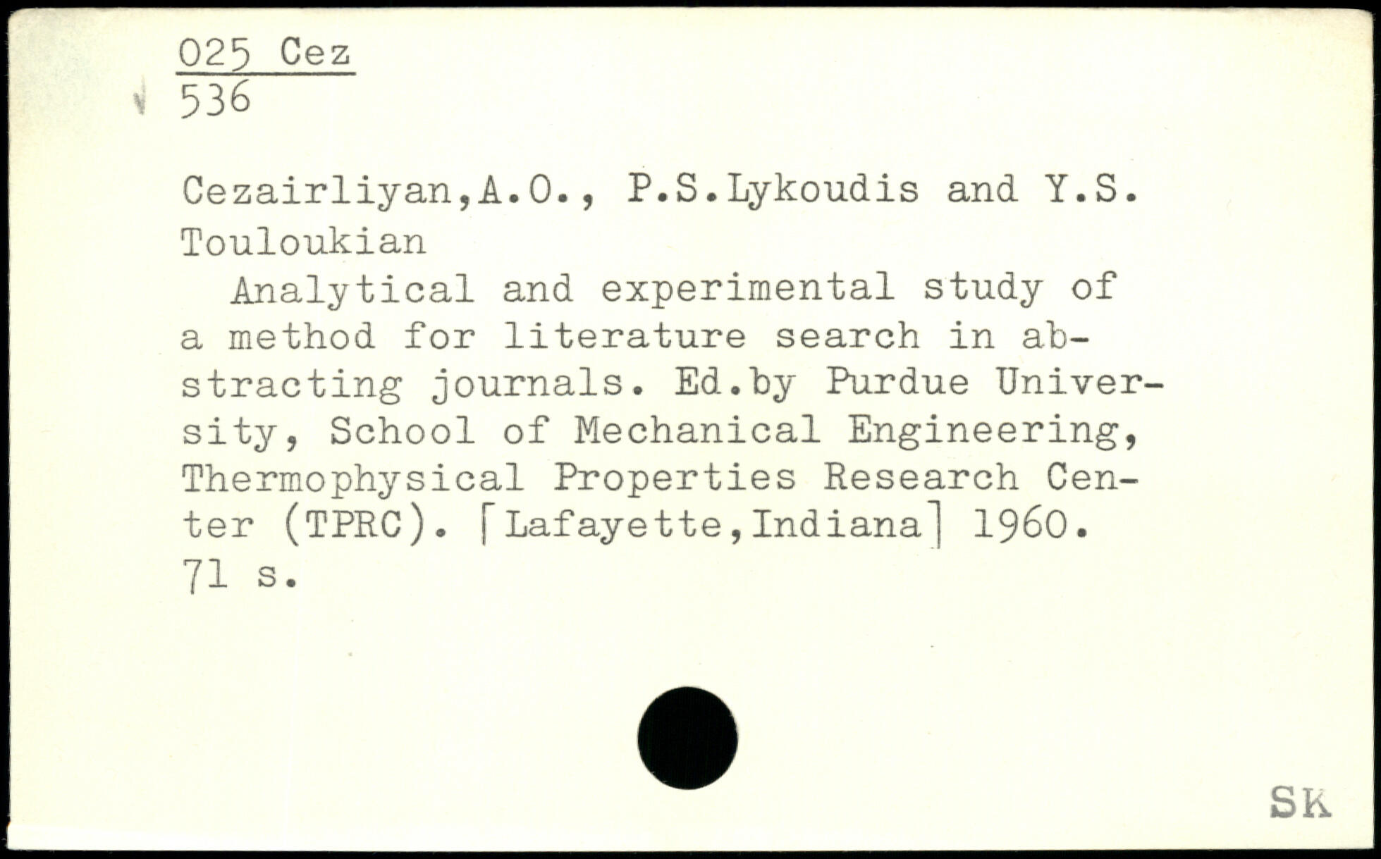 Cezairliyan,A.0., P.S.Lykoudis and Y.S. Touloukian Analytical and experimental study of a method for literature search in abstracting journals. Ed.by Purdue University, School of Mechanical Engineering, Thermophysical Properties Research Center (TPRC). [~Lafayette , Indiana] 1960.
