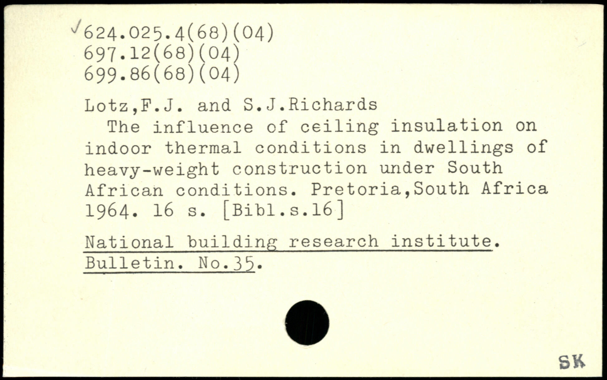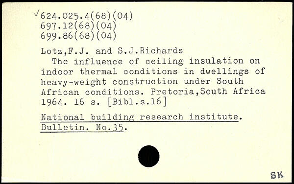 The influence of ceiling insulation on indoor thermal conditions in dwellings of heavy-weight construction under South African conditions. Pretoria,South Africa 1964.