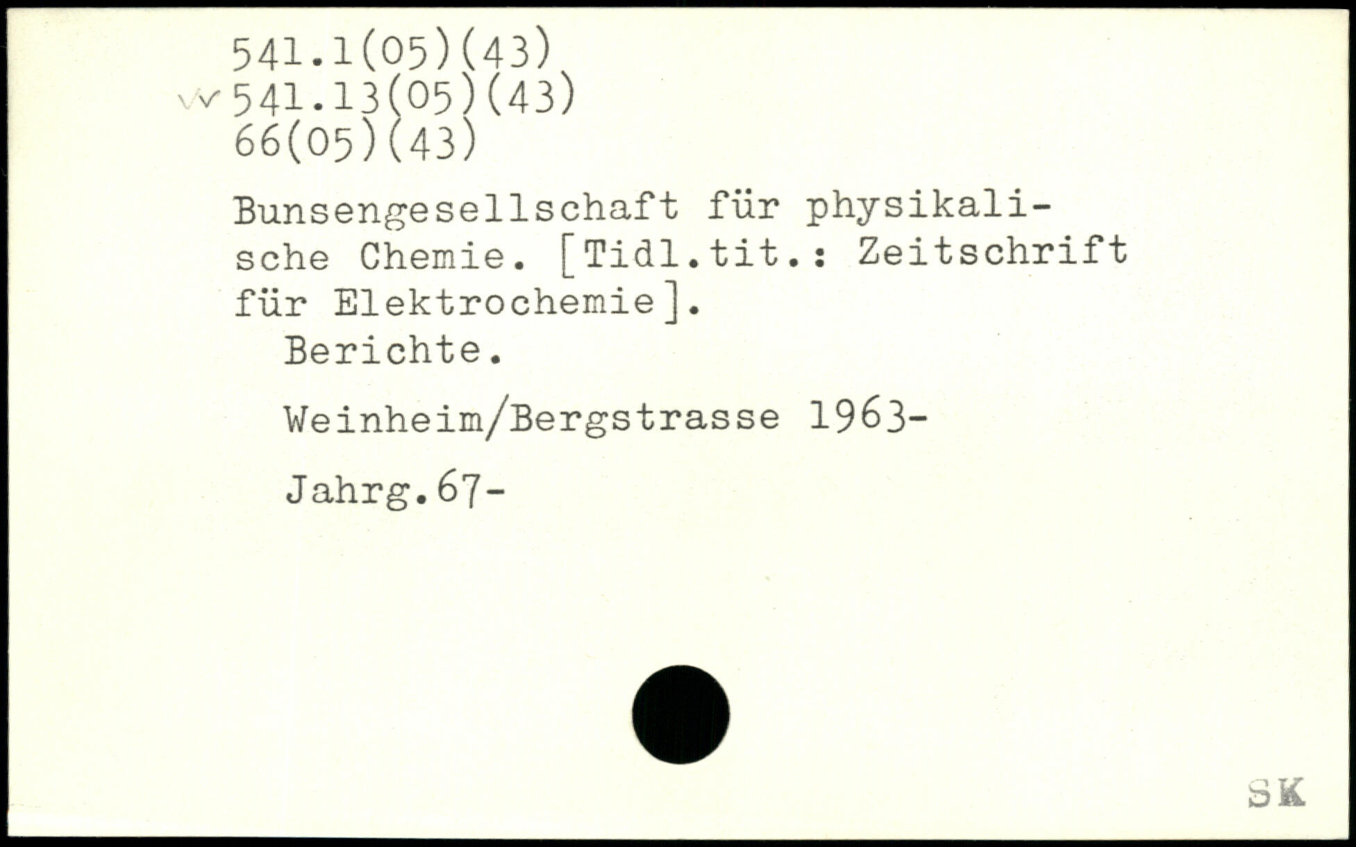 BunsengeSeilschaft für physikalische Chemie. [Tidl.tit.: Zeitschrift für Elektrochemie], Berichte. Weinheim/Bergstrasse 1963-Jahrg.67-