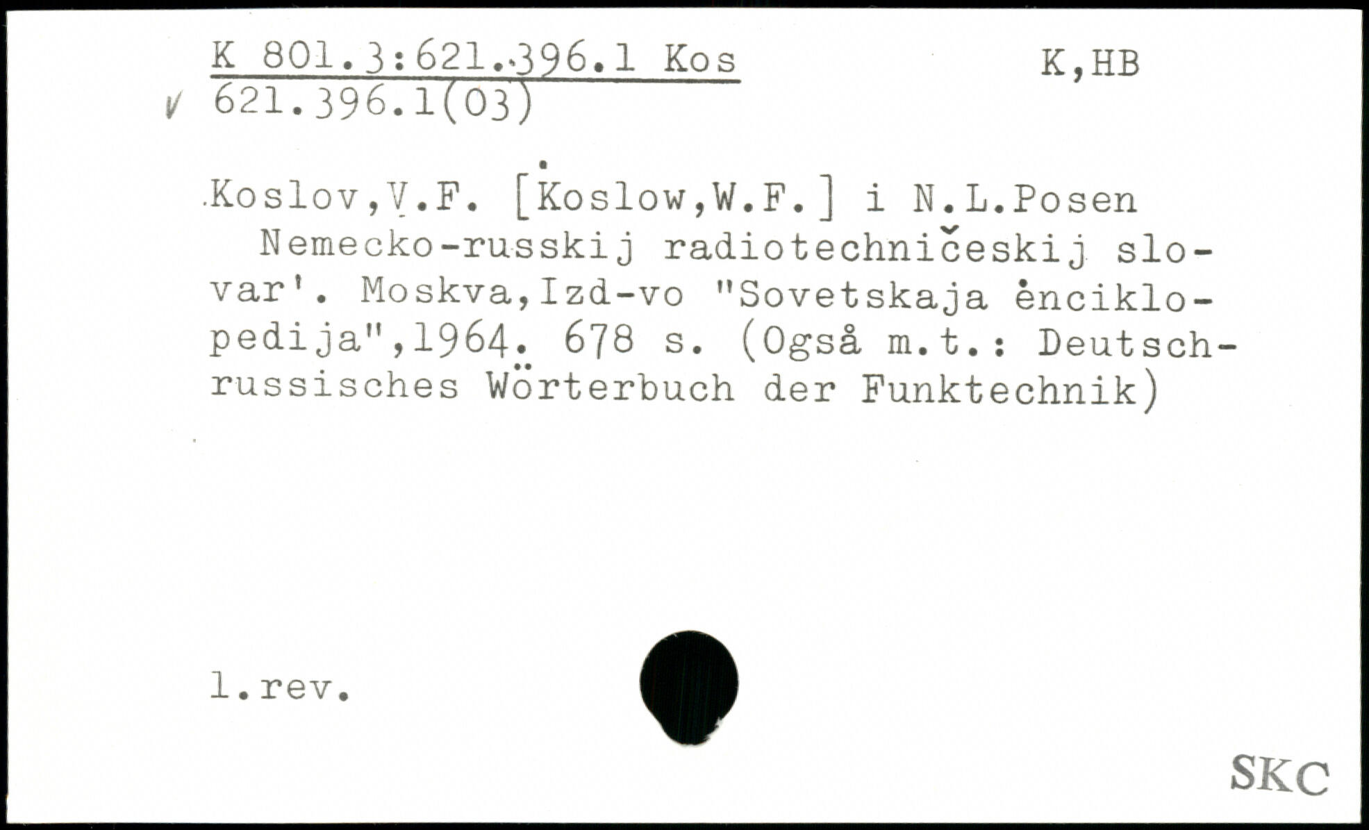 .Koslov,V.F. [Kos1ow,W.F.] i N.L.Posen Nemecko-russkij radiotechniceskij slo-var'. Moskva,Izd-vo "Sovetskaja enciklo-pedija",1964.