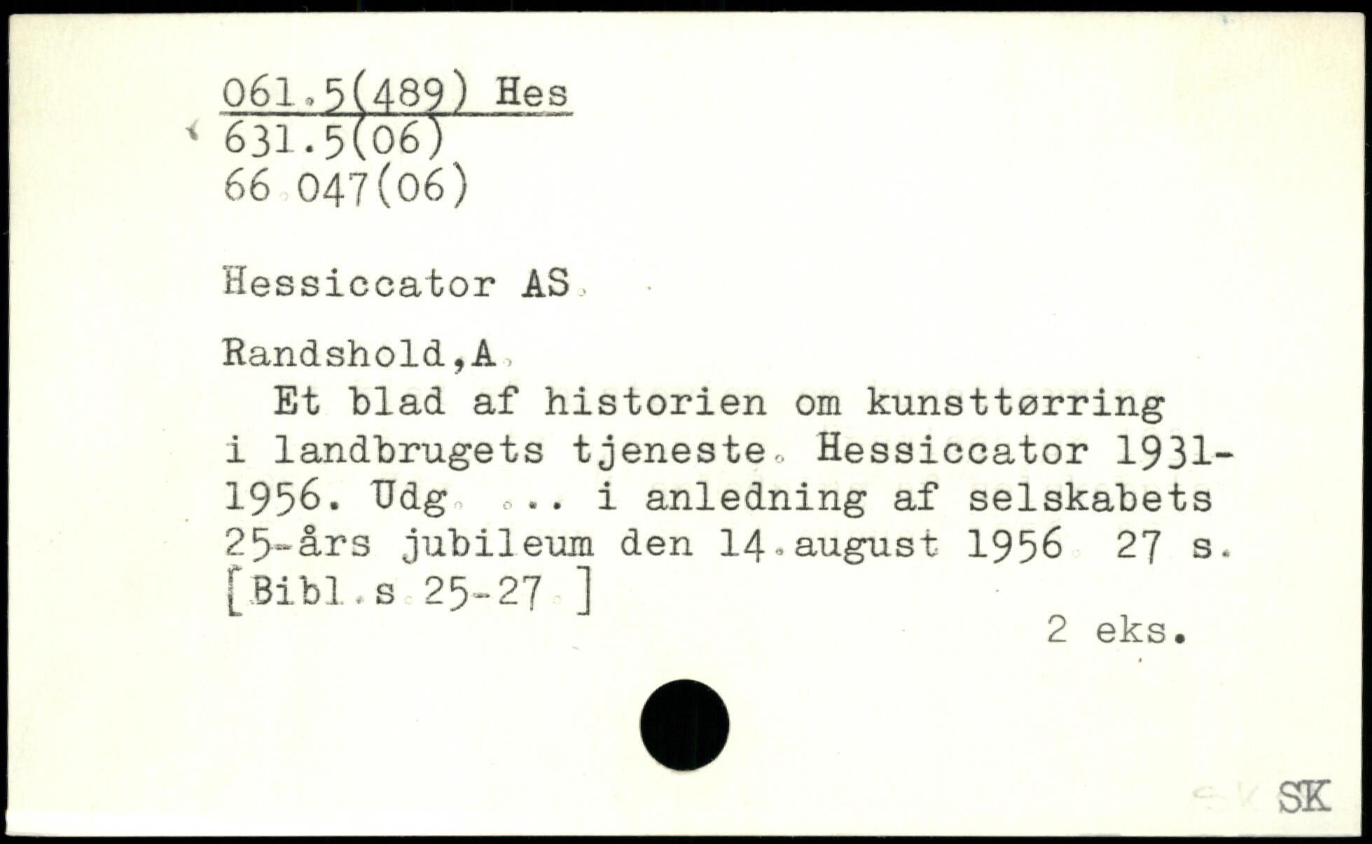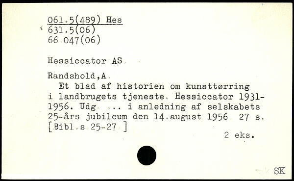 Hessiccator AS, Randshold,A Et blad af historien om kunsttørring i i landbrugets tjeneste- Hessiccator 1931-1956. Hdg o.. i anledning af selskabets 25-års jubileum den 14-august 1956