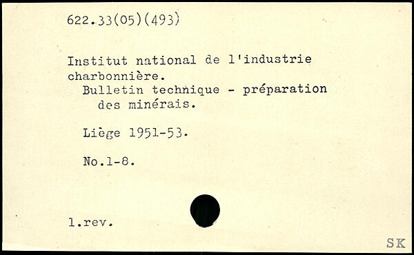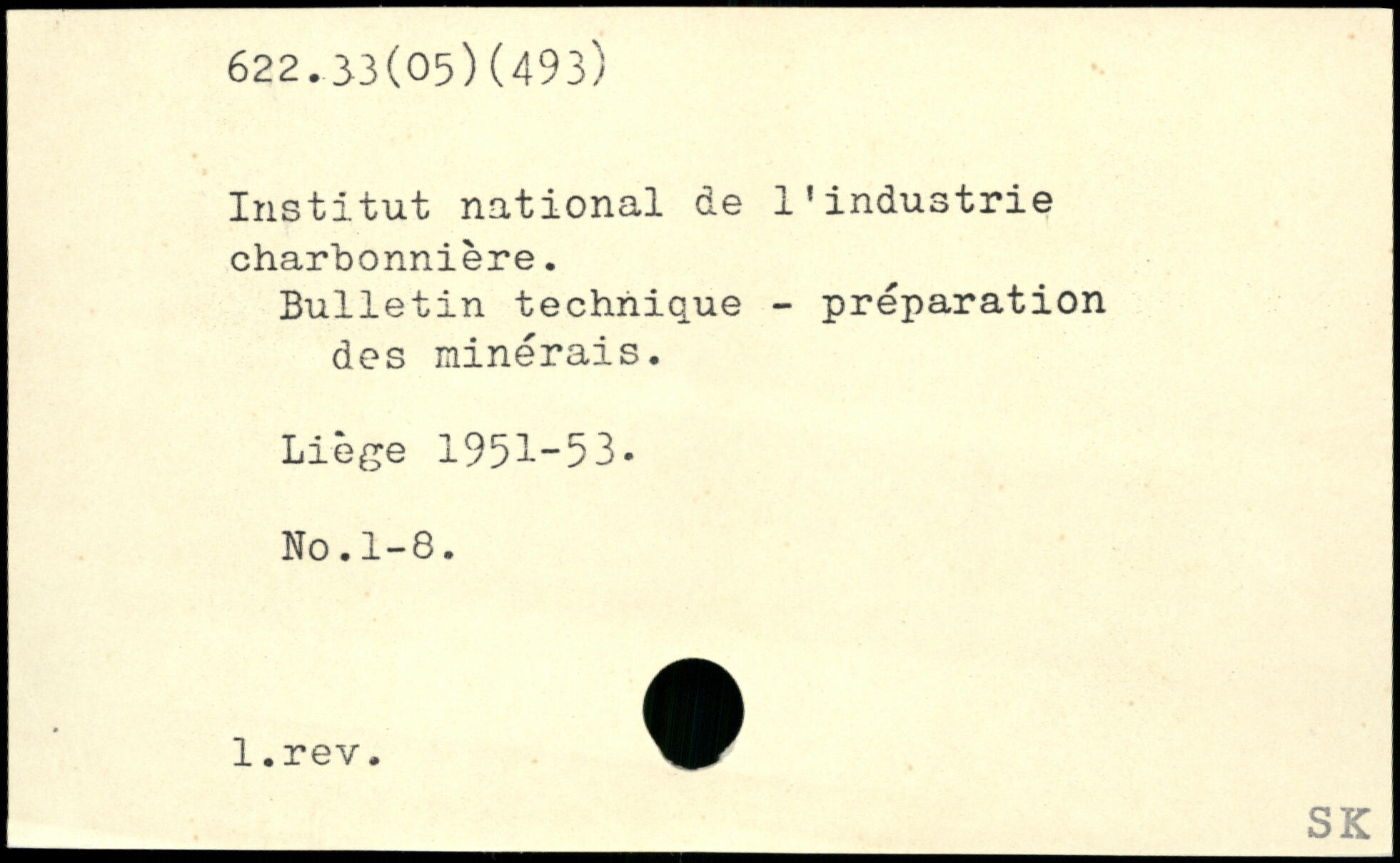Institut national de l'industrie charbonnière. Bulletin technique - préparation des minerais. Liège 1951-53- No.1-8.