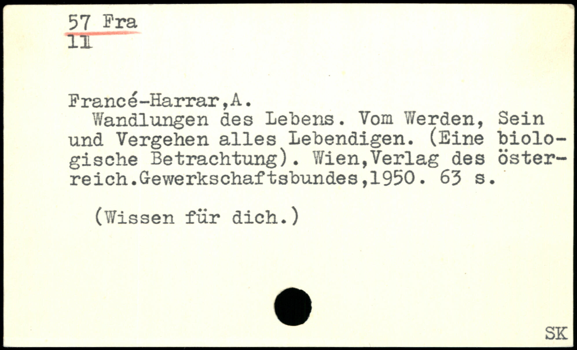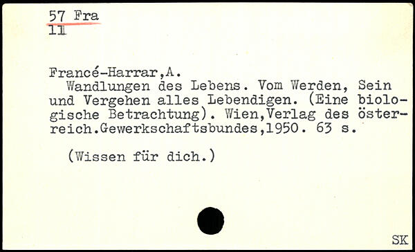 Wandlungen des Lebens. Vom Werden, Sein und Vergehen alles Lebendigen. (Eine biologische Betrachtung). Wien,Verlag des öster-reich.G-ewerkschaftsbundes,1950.