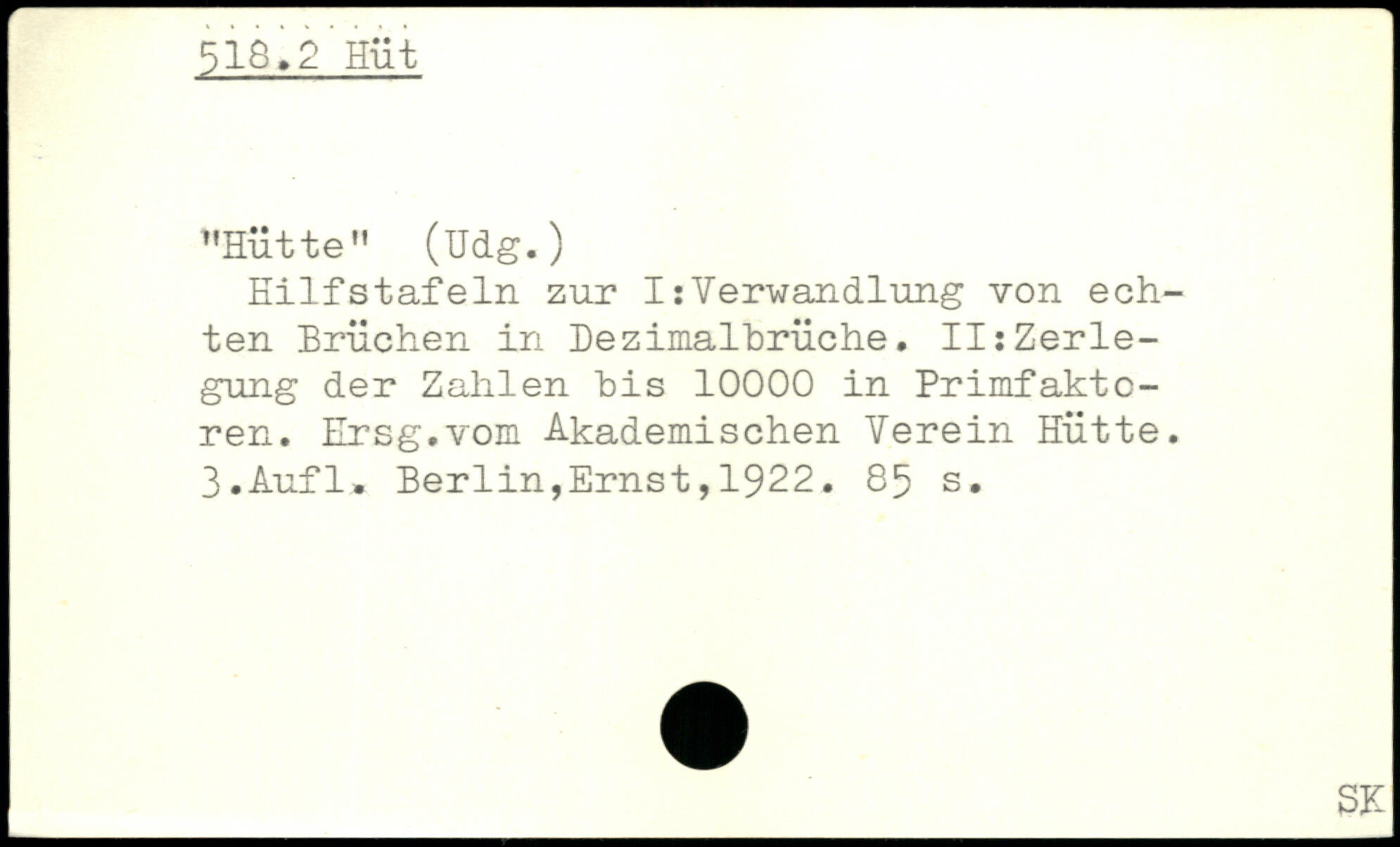 Hilfstafeln zur I:Verwandlung von echten Brüchen in Dezimalbrüche. II:Zerlegung der Zahlen bis 1000O in Primfaktoren. Hrsg.vom Akademischen Verein Hütte.
