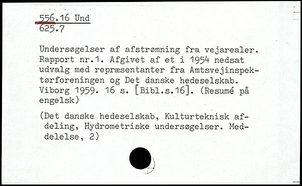 Undersøgelser af afstrømning fra vejarealer. Rapport nr.1. Afgivet af et i 195.f nedsat udvalg med repræsentanter fra Amtsvejinspektørforeningen og Det danske hedeselskab. Viborg 1959.