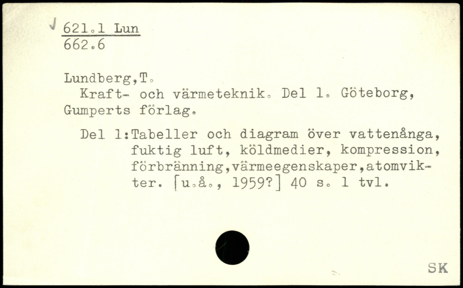 Kraft- och värmetekniko Del 1, Göteborg, Gumperts förlag, Del 1:Tabeller och diagram över vattenånga, fuktig luft, köldmedier, kompression, förbränning,värmeegenskaper,atomvikter. fu,,åo, 1959?]