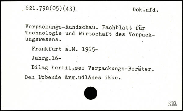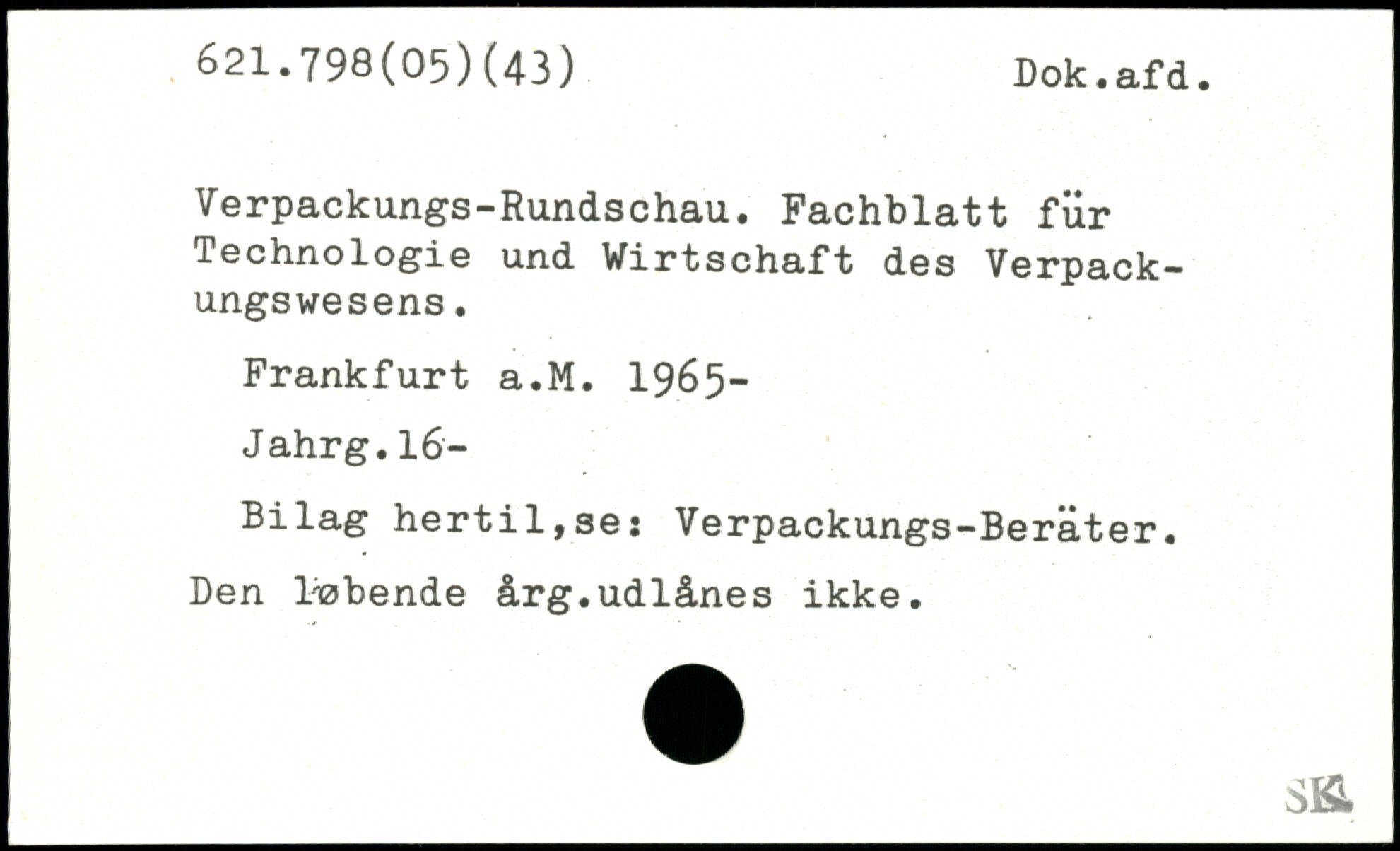Verpackungs-Rundschau. Fachblatt für Technologie und Wirtschaft des Verpackungswesens. Frankfurt a.M. 1965— Jahrg.16- Bilag hertil,sei Verpackungs-Berater. Den lebende årg.udlånes ikke.