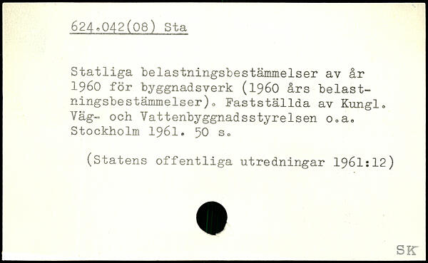 Statliga belastningsbestämmelser av år 1960 för byggnadsverk (1960 års belast-ningsbestämmelser), Fastställda av Kunglo Väg- och Vattenbyggnadsstyrelsen o0a.