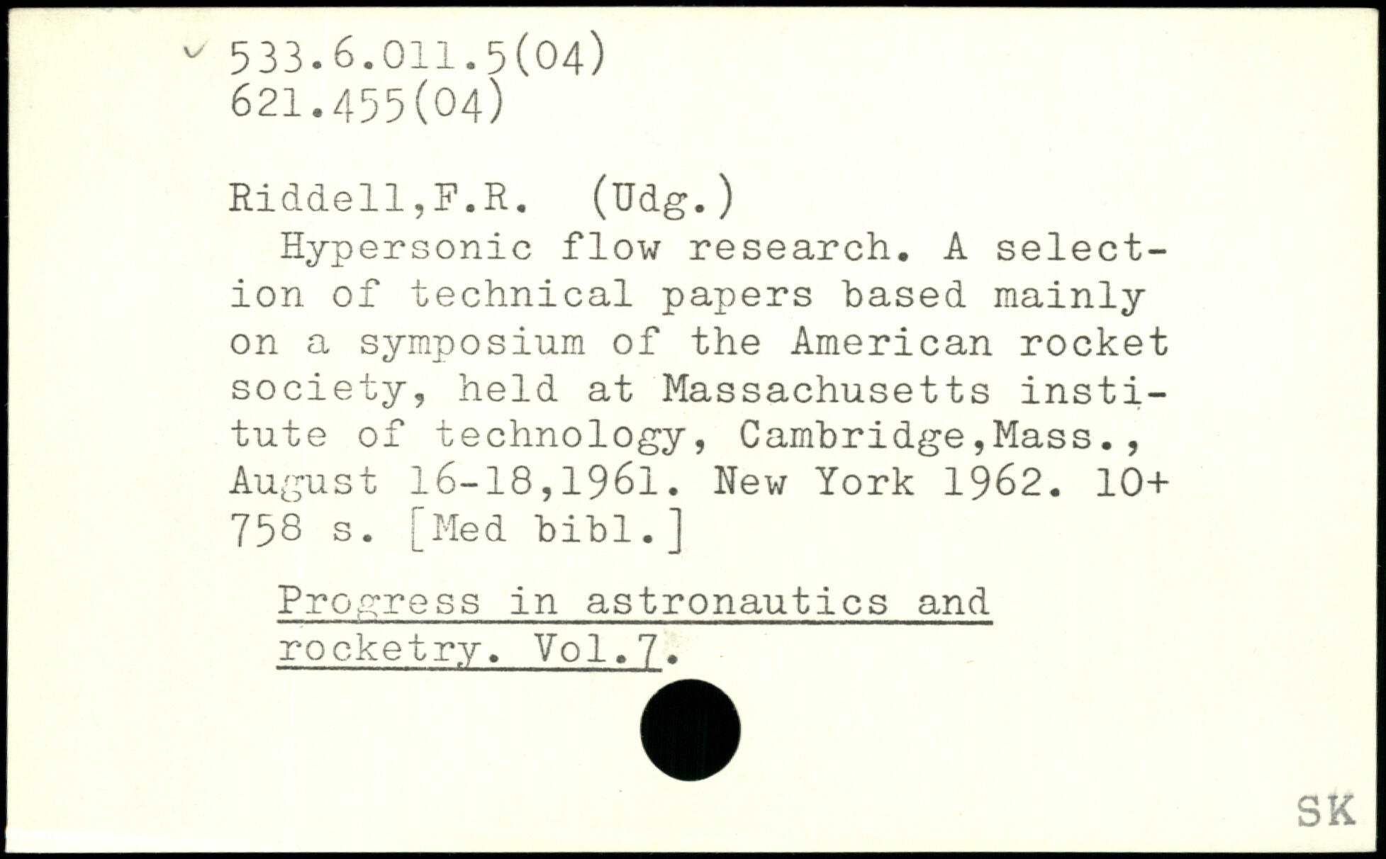 Hypersonic flow research. A selection of technical papers based mainly on a symposium of the American rocket society, held at Massachusetts institute of technology, Cambridge,Mass., August 16-18,1961.