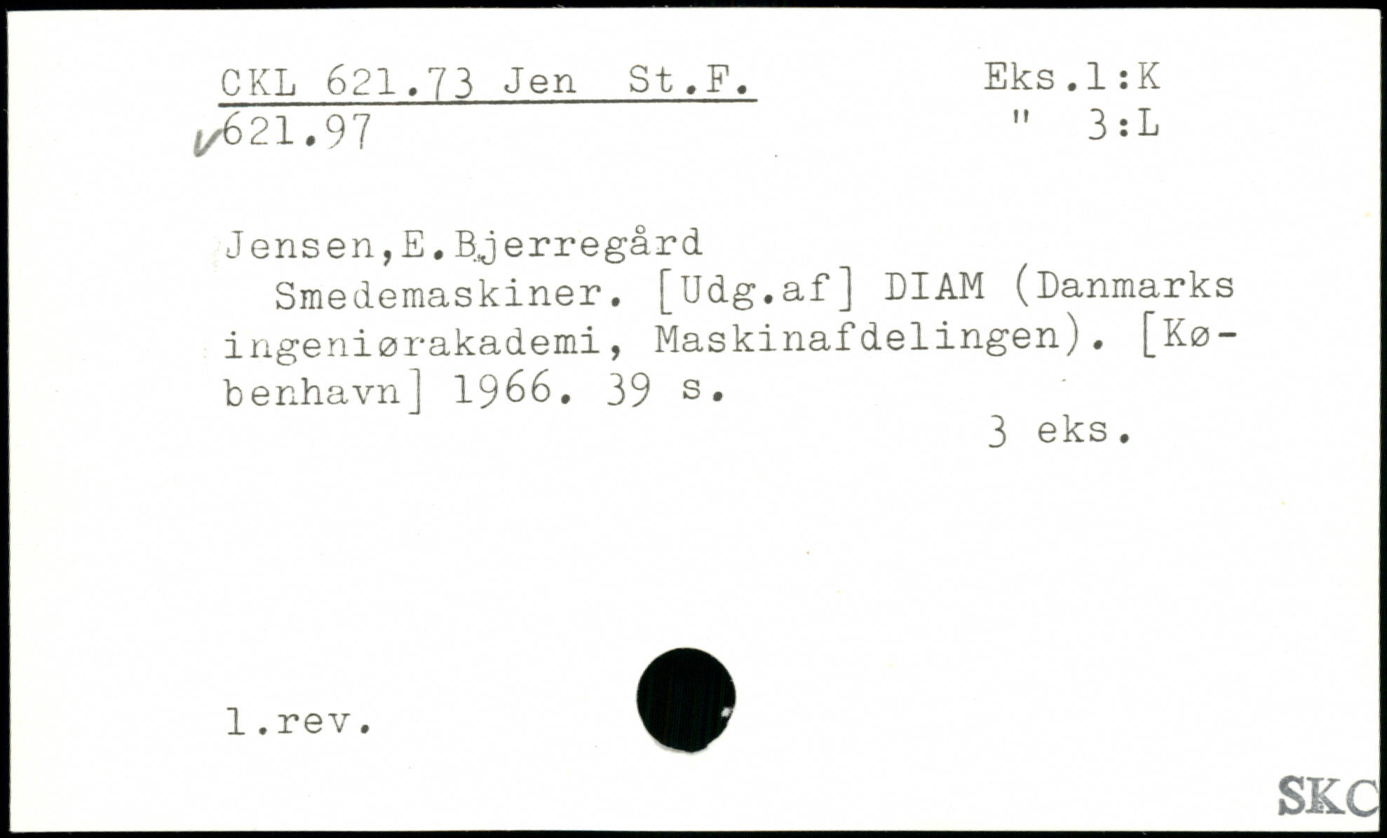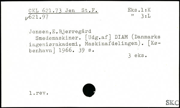 Jensen,E,Bjerregård Smedemaskiner. [Udg.af] DIAM (Danmarks ingeniørakademi, Maskinafdelingen).