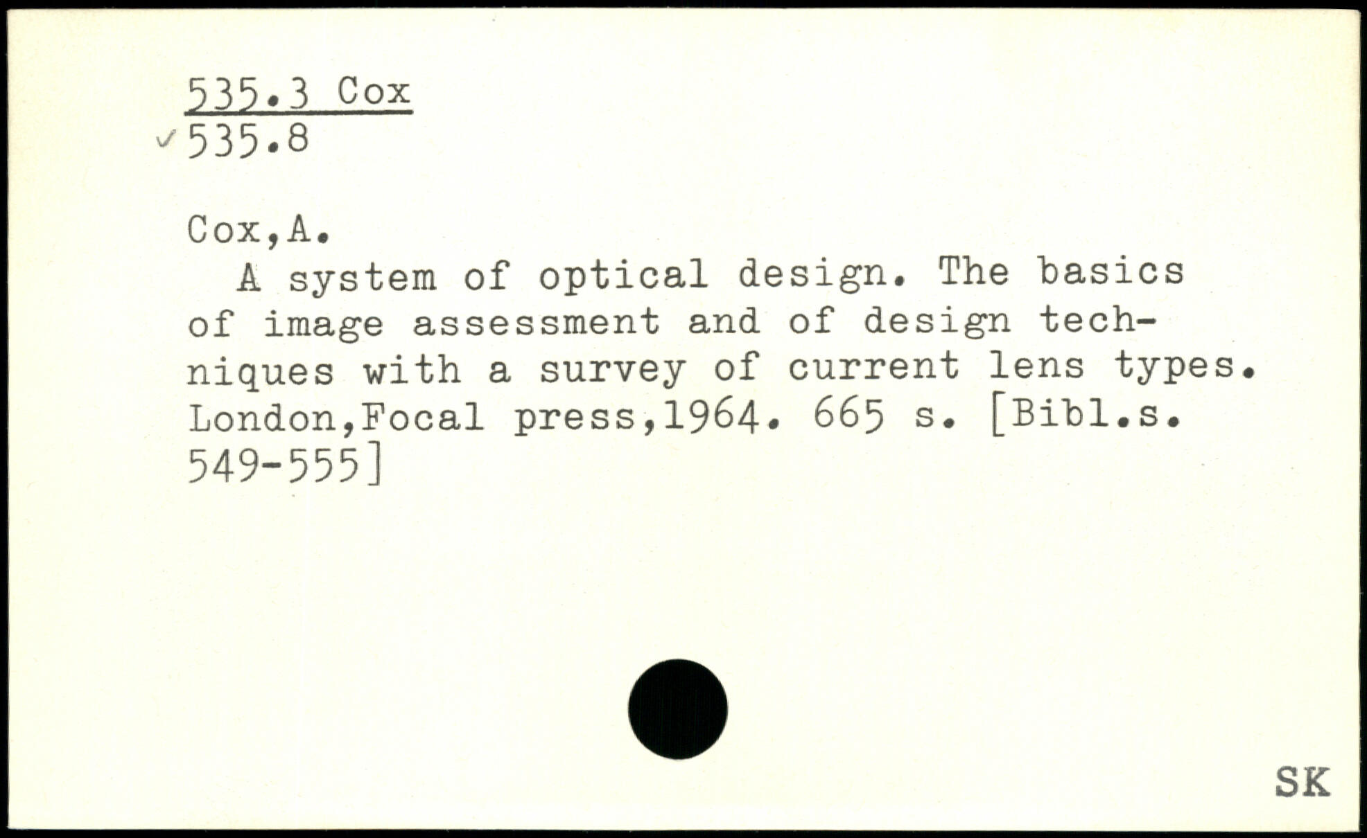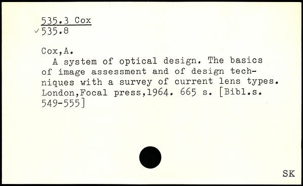 A system of optical design. The basics of image assessment and of design techniques with a survey of current lens types.