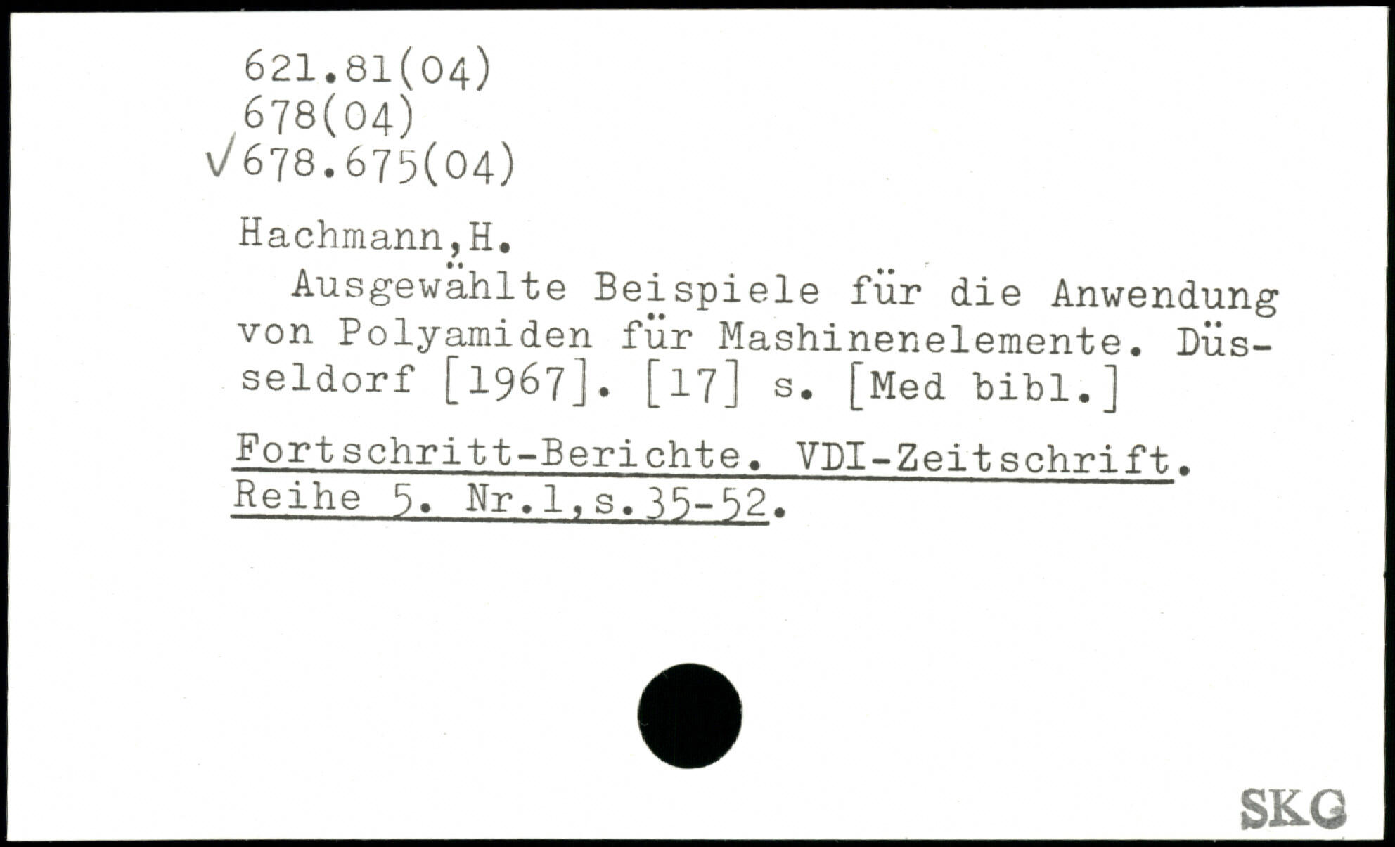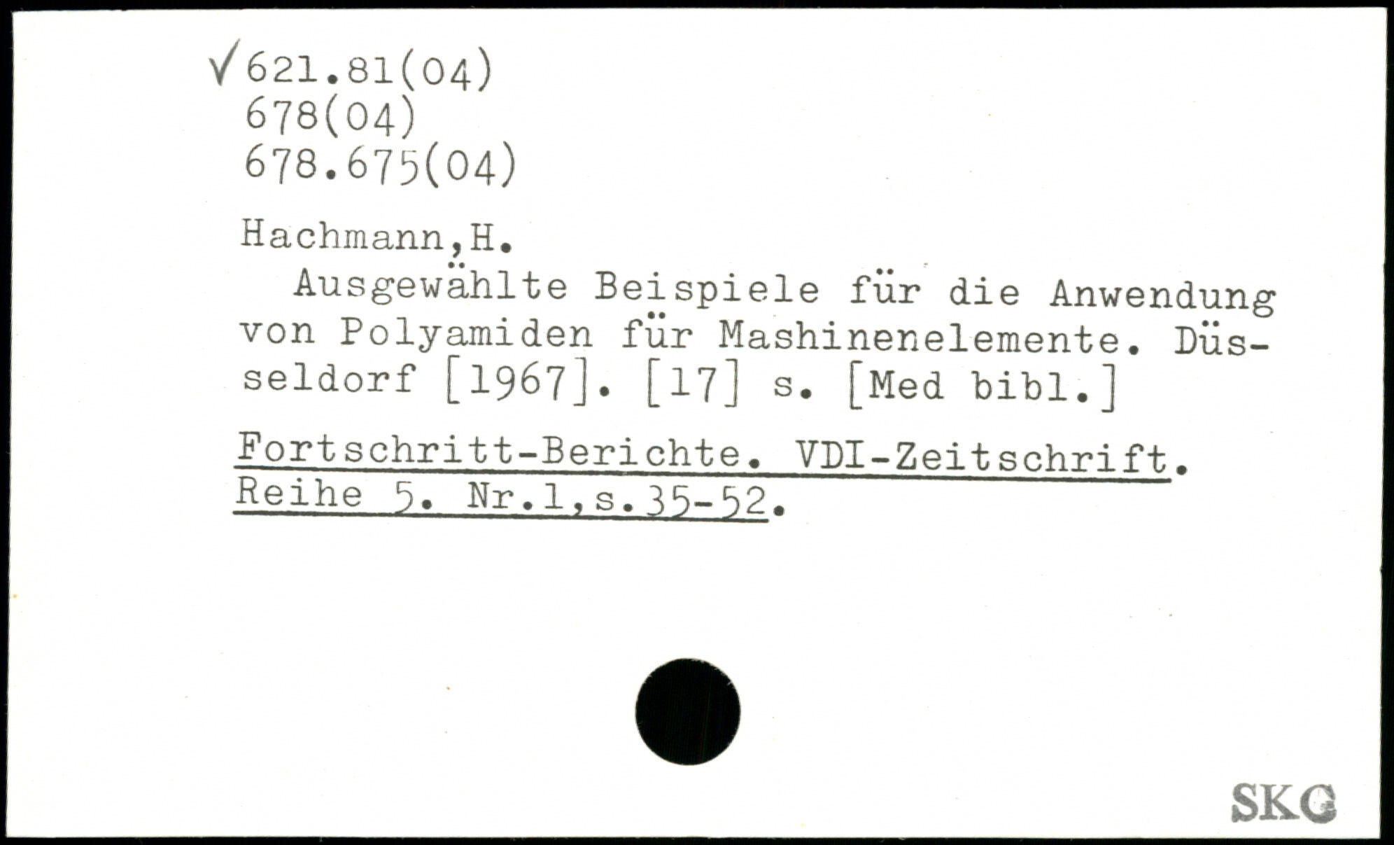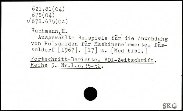 Ausgewahlte Beispiele für die Anwendung von Polyamiden für Mashinenelemente. Düsseldorf [1967]. [17] s. [Med bibl.] Fortschritt-Berichte. YDI-Zeitschrift. Reihe Nr,1.s.15-S2.
