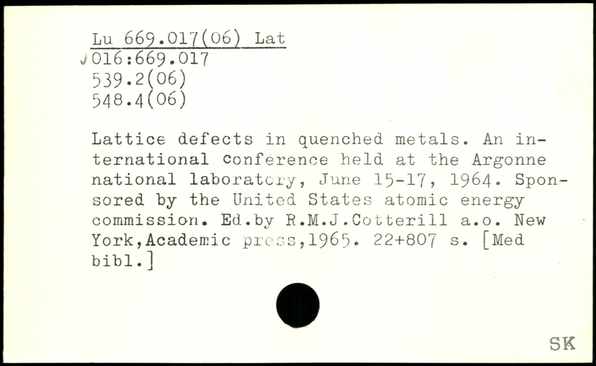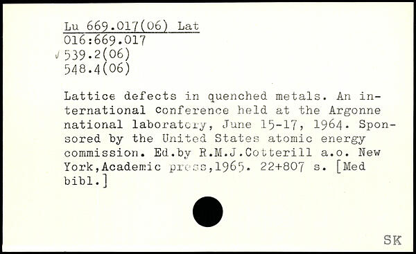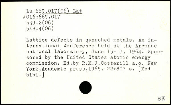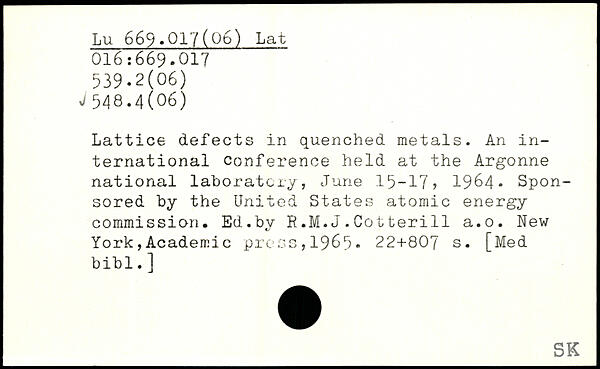 Lattice defects in quenched metals. An international conference held at the Argonne national laboratory, June 15-17) 1964. Sponsored by the United States atomic energy commission. Ed.by R.M.J.Cotterill a.o.
