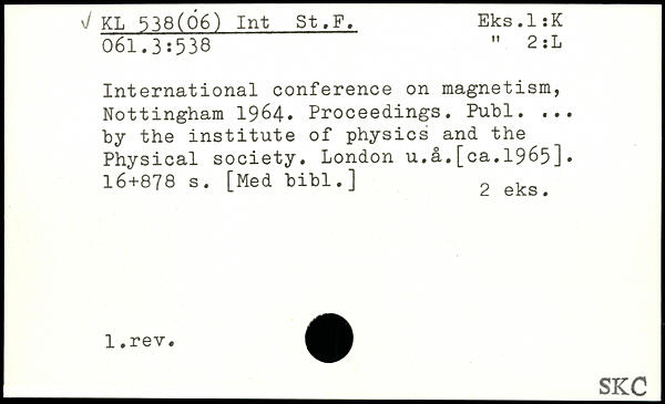 International conference on magnetism, Nottingham 1964. Proceedings. Publ. ... by the institute of physics and the Physical society. London u.a.[ca.1965].