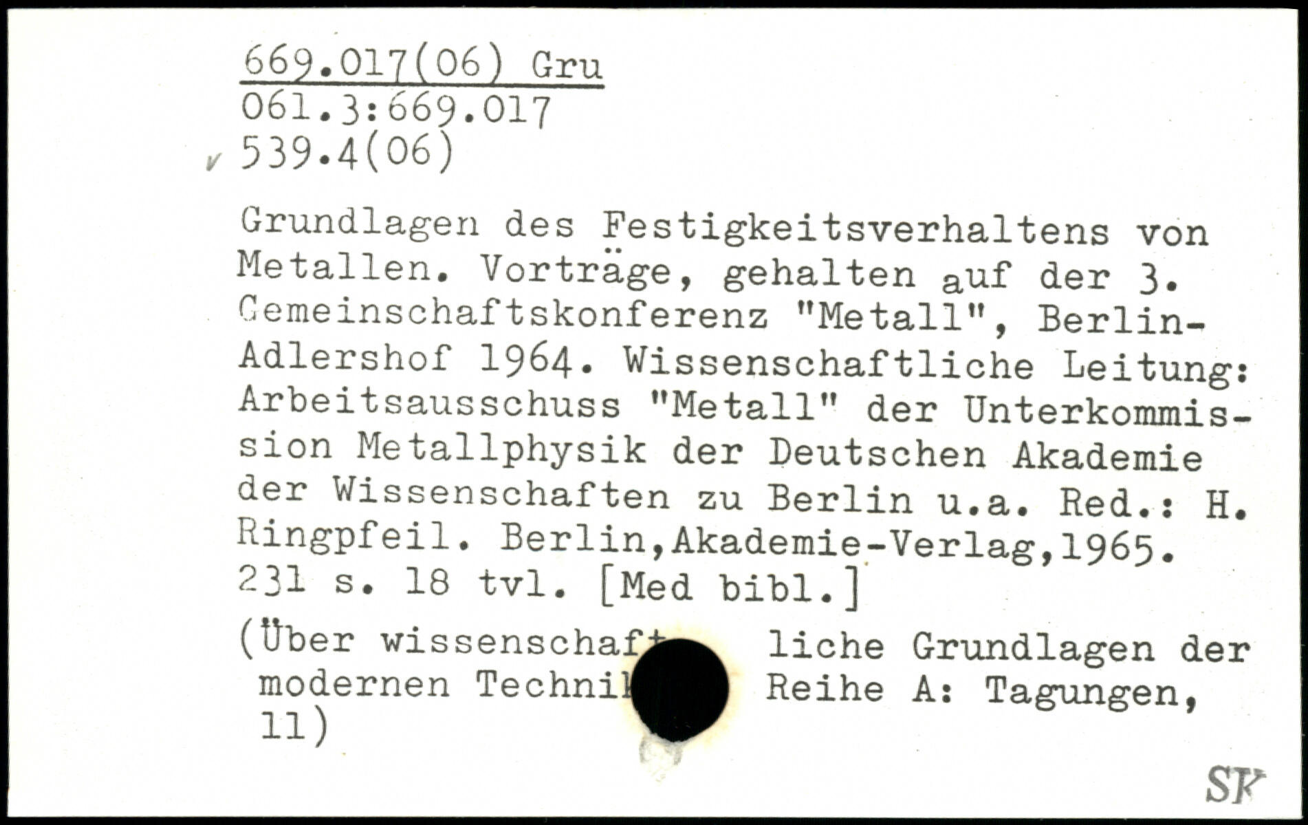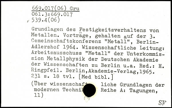 Grundlagen des Festigkeitsverhaltens von Metallen. Vorträge, gehalten auf der 3. Gemeinschaftskonferenz "Metall", Berlin-Adlershof 1964. Wissenschaftliche Leitung: Arbeitsausschuss "Metall" der Unterkommission Metallphysik der Deutschen Akademie der Wissenschaften zu Berlin u.a. Red.: H. Ringpfeil.