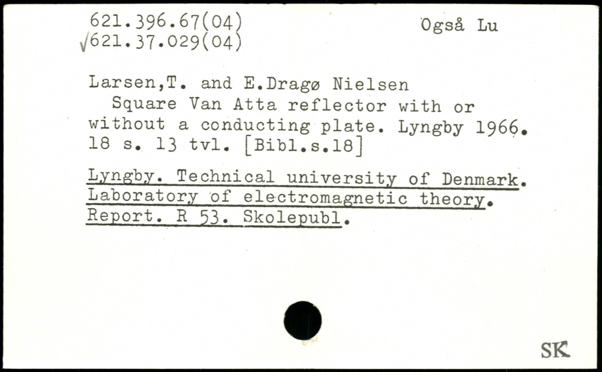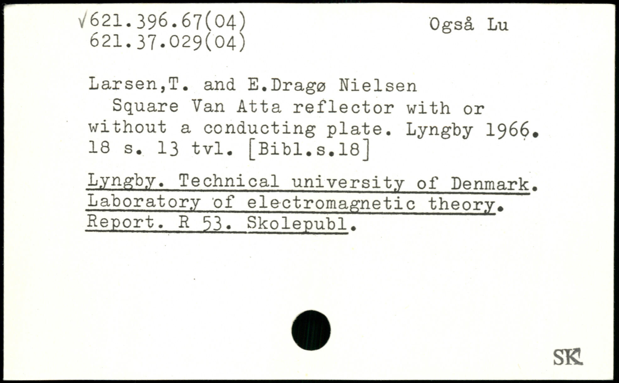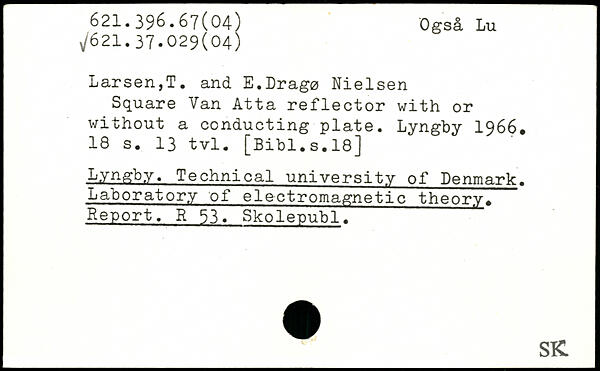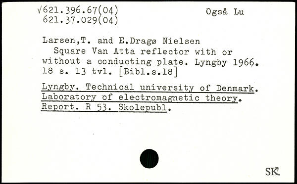 Larsen,T. and E.Dragø Nielsen Square Van Atta reflector with or without a conducting plate. Lyngby 1966.