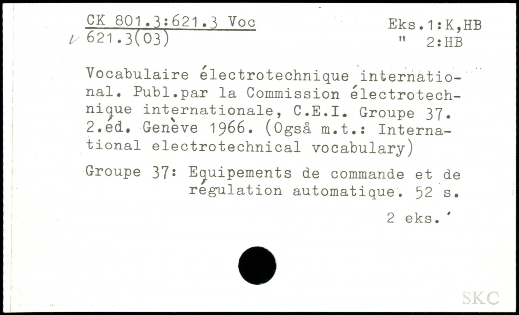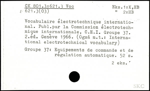 Vocabulaire électrotechnique international. Publ.par la Commission électrotechnique internationale, C.E.I. Groupe 37. 2.éd. Genève 1966. (Ogsâm.t.: International electrotechnical vocabulary) Groupe 37: Equipements de commande et de regulation automatique.