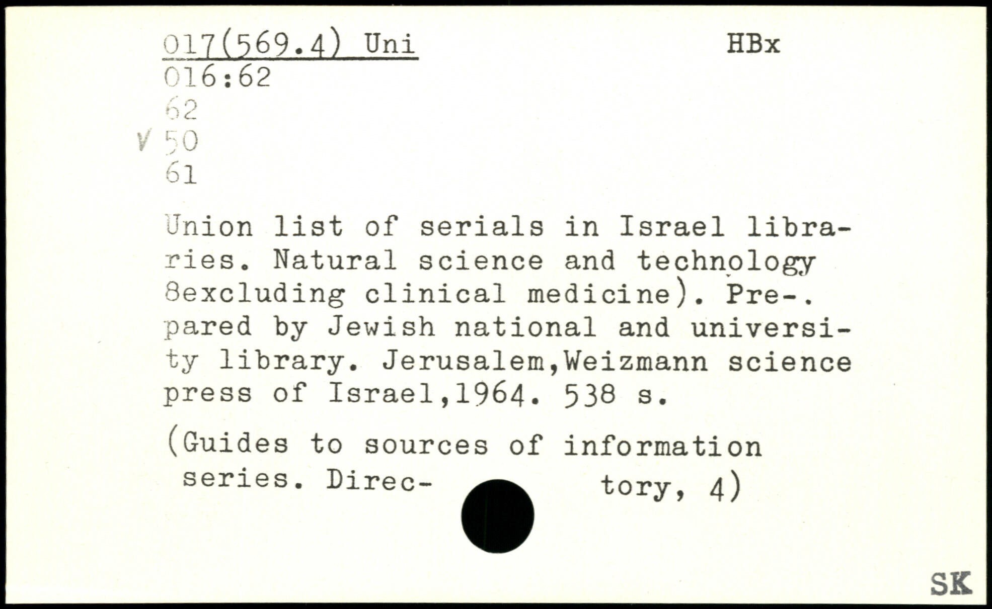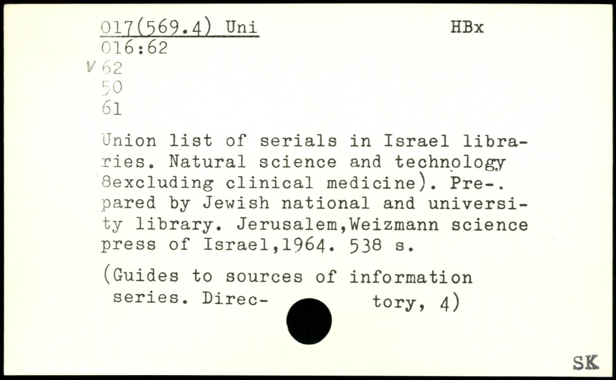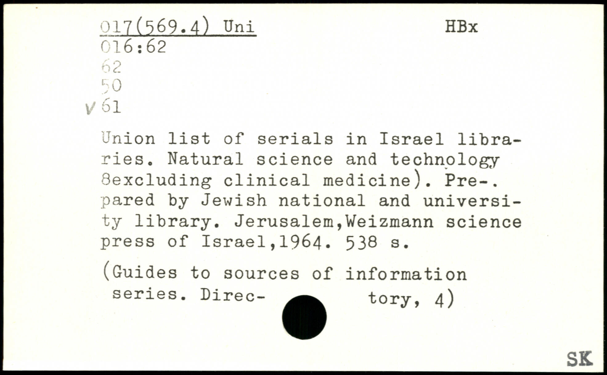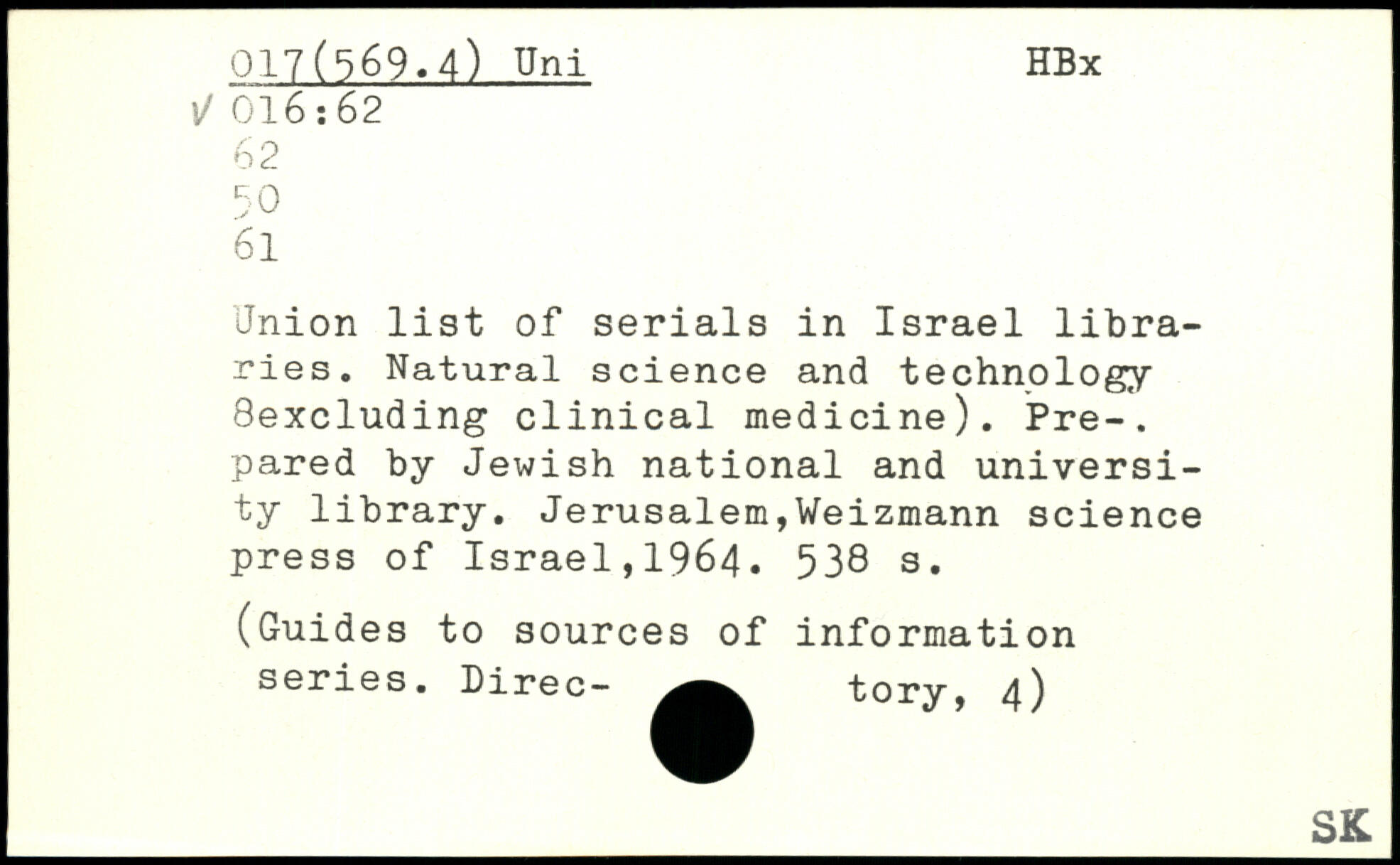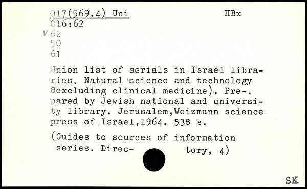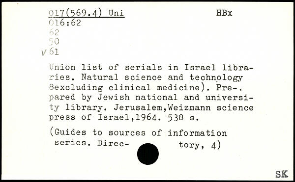 Union list of serials in Israel libraries. Natural science and technology 8excluding clinical medicine). Pre-. pared by Jewish national and university library. Jerusalem,Weizmann science press of Israel,1964.