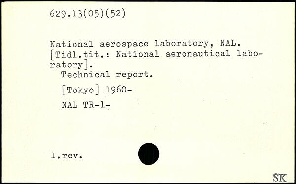 National aerospace laboratory, NAL. [Tidl.tit.: National aeronautical laboratory]. Technical report.