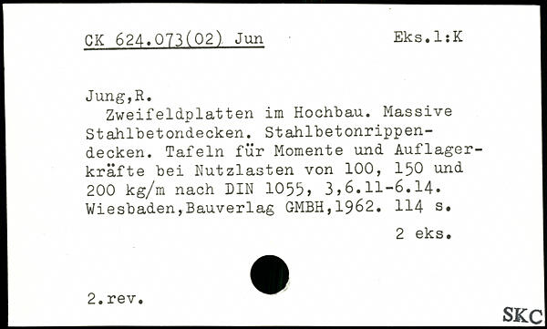 Zweifeldplatten im Hochbau. Massive Stahlbetondecken. Stahlbetonrippendecken. Tafeln für Momente und Auflagerkräfte bei Nutzlasten von 100, 150 und 200 kg/m nach DIN 1055, 3,6.11-6.14. Wiesbaden,Bauverlag GMBH,19^2.