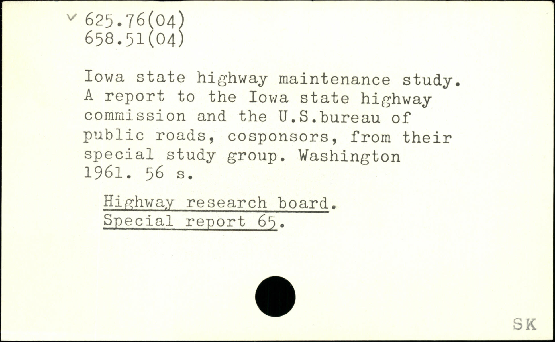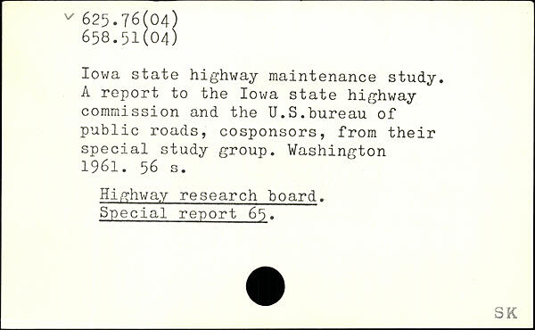 Iowa state highway maintenance study. A report to the Iowa state highway commission and the U.S.bureau of public roads, cosponsors, from their special study group.