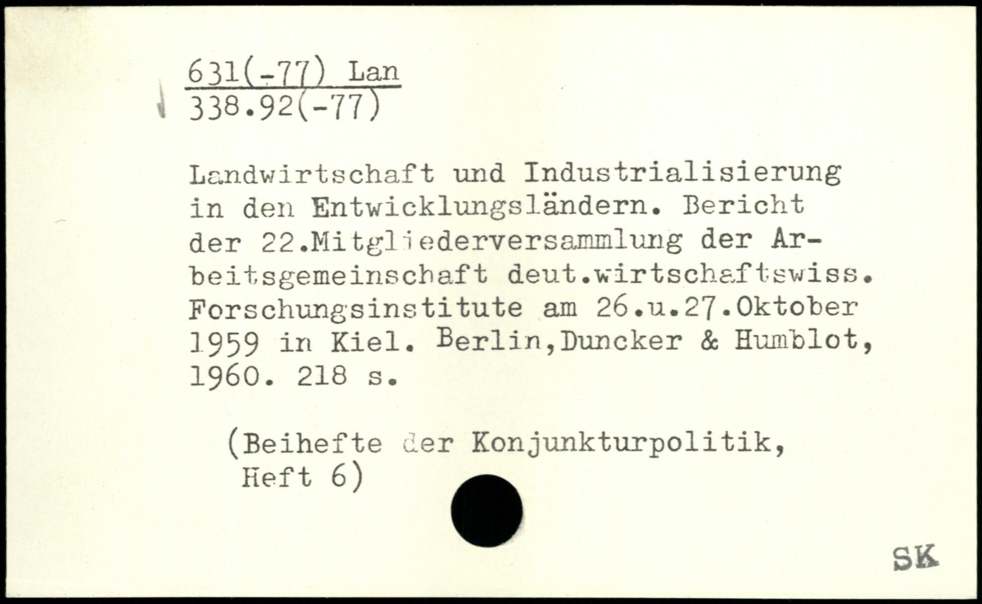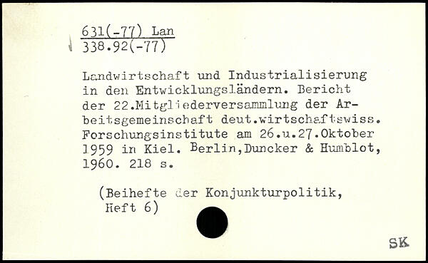 Landwirtschaft und Industrialisierung in den Entwicklungsländern. Bericht der 22.Mitgliederversammlung der Arbeitsgemeinschaft deut.Wirtschaftswiss. Forschungsinstitute am 26.u.27.Oktober 1959 in Kiel.