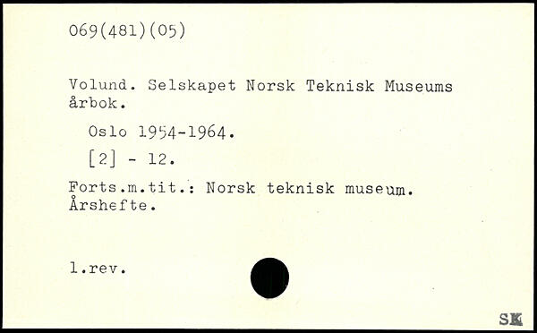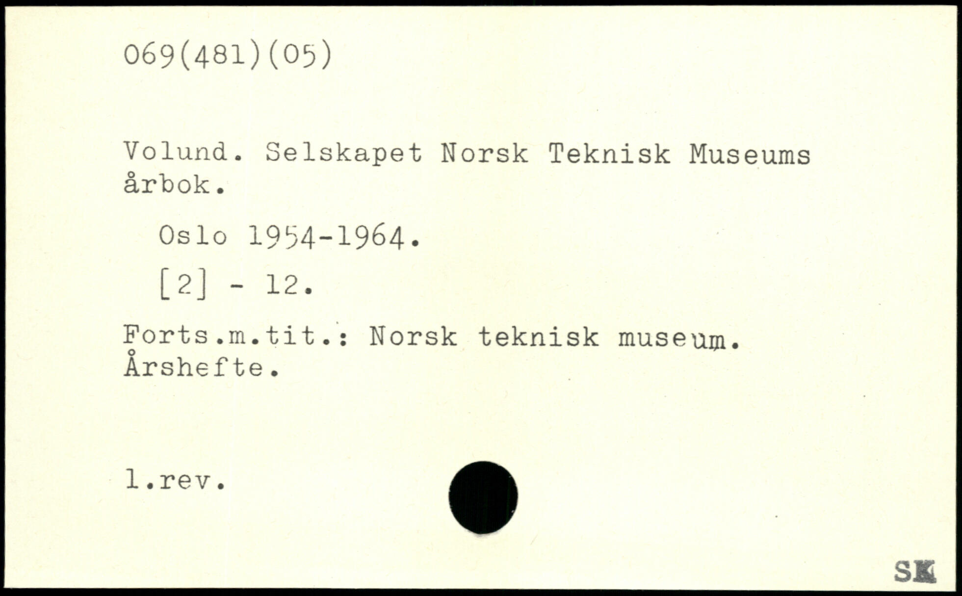 Volund. Selskapet Norsk Teknisk Museums årbok. Oslo 1954-1964. Ports.m.tit.; Norsk teknisk museum. Arshef te.