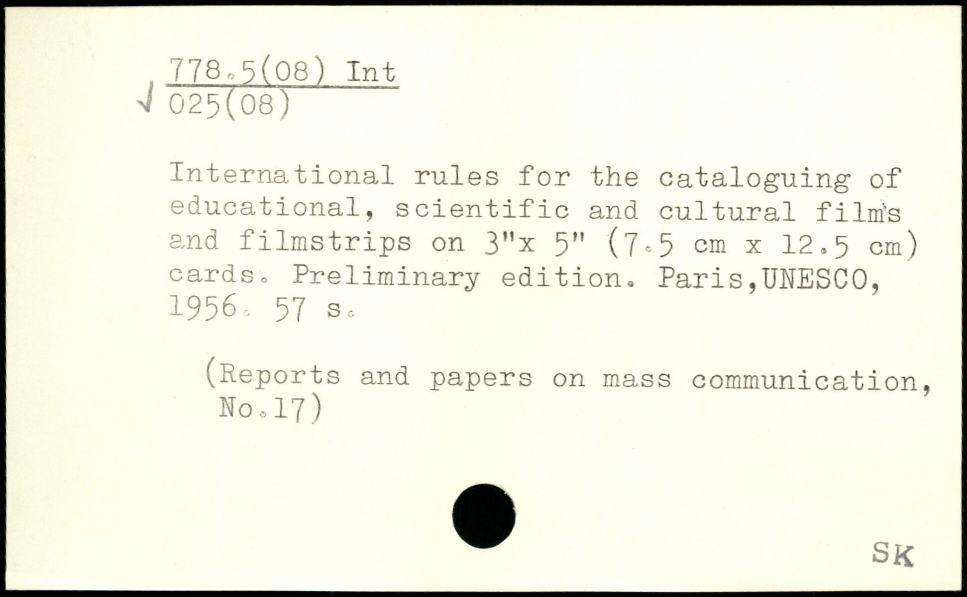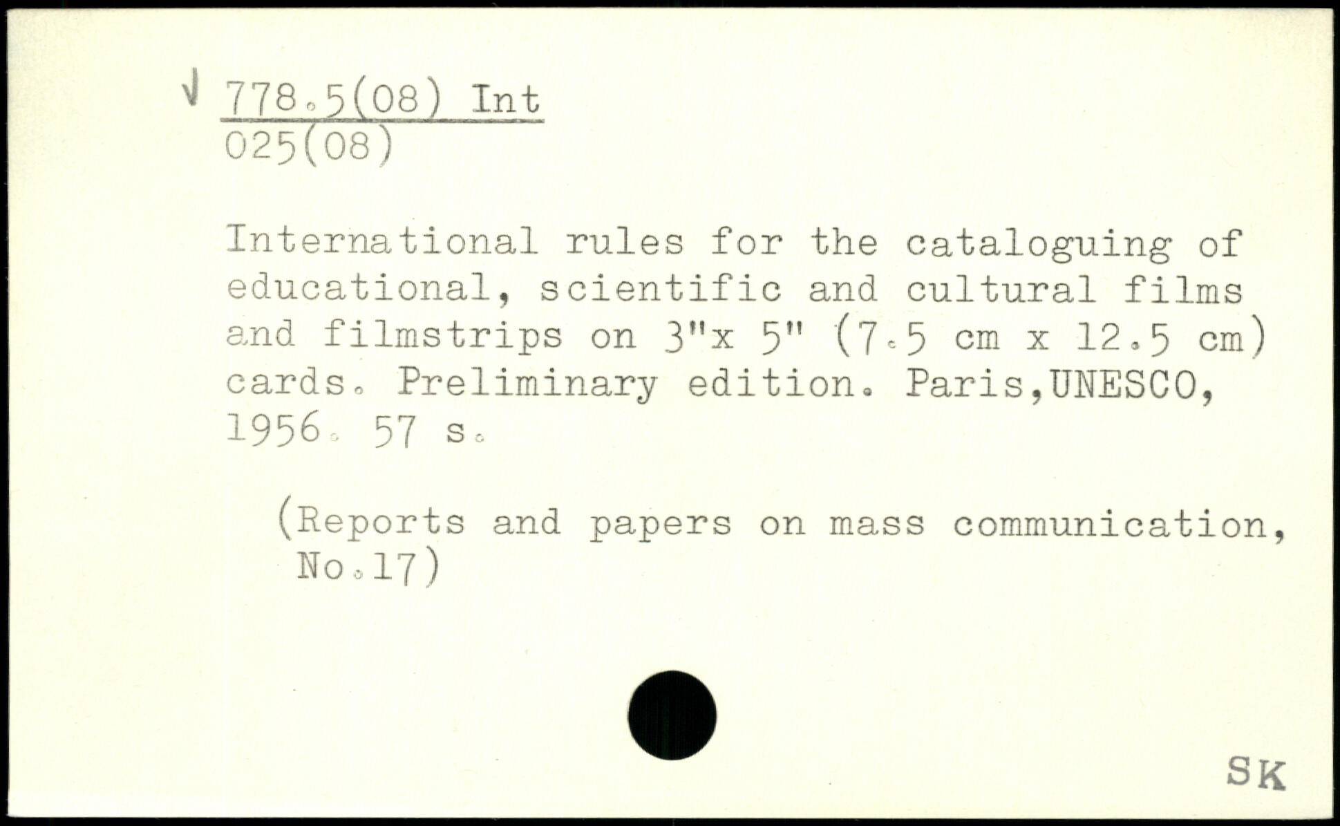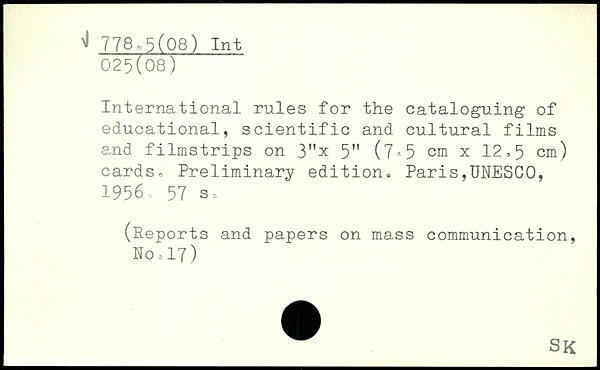 International rules for the cataloguing of educational, scientific and cultural films and filmstrips on 3"x 5" (7<=5 cm x 12 >5 cm) cards.