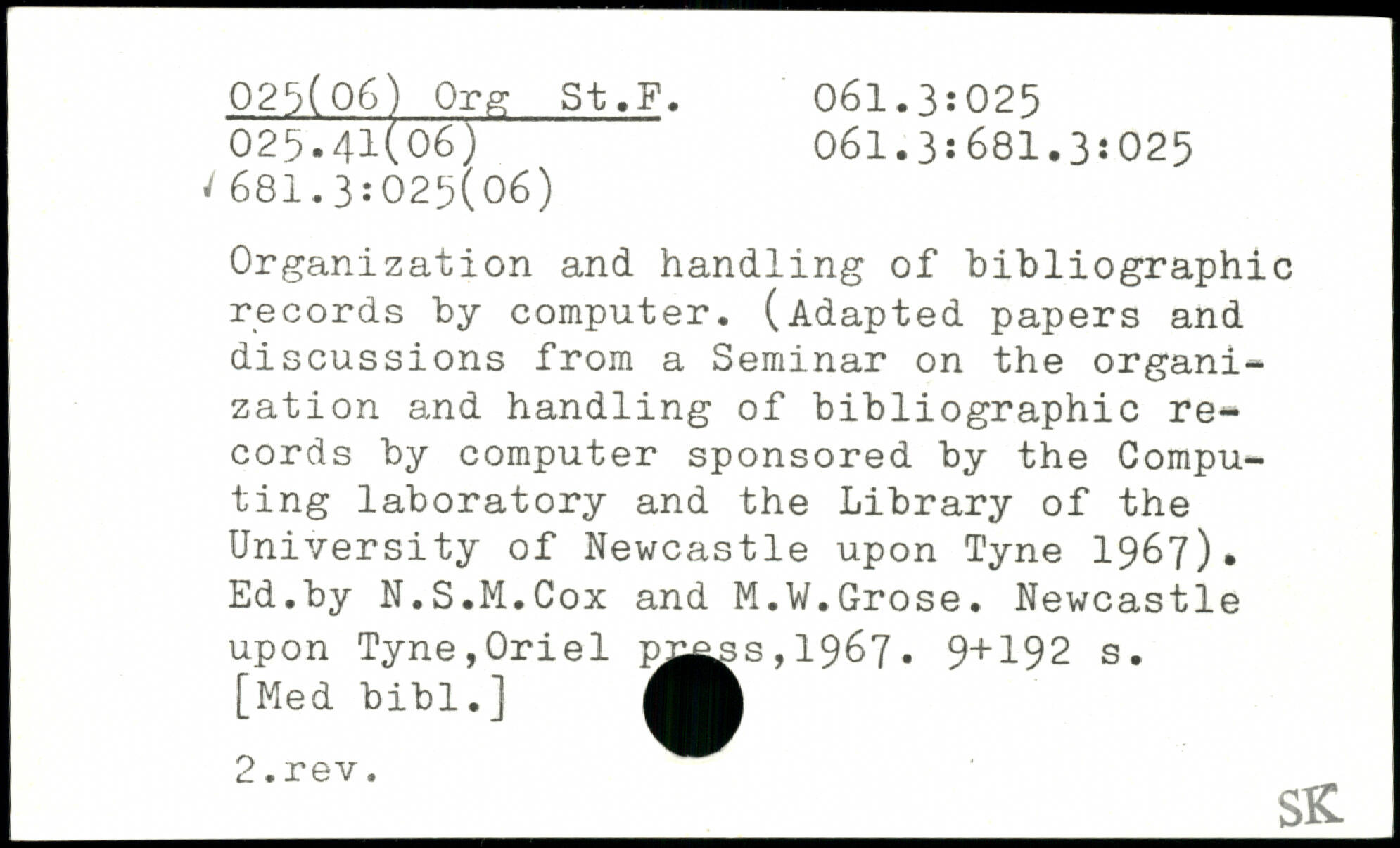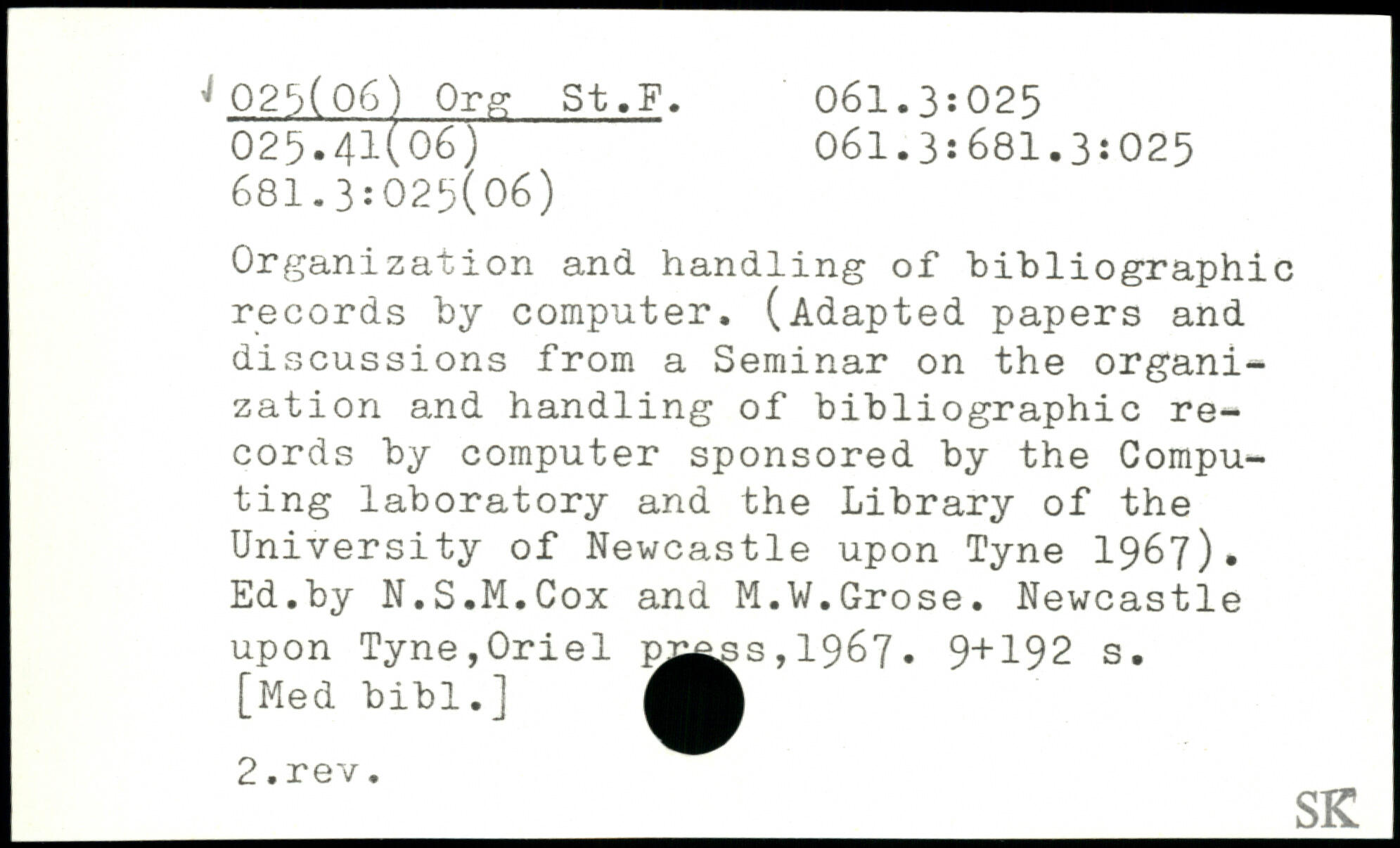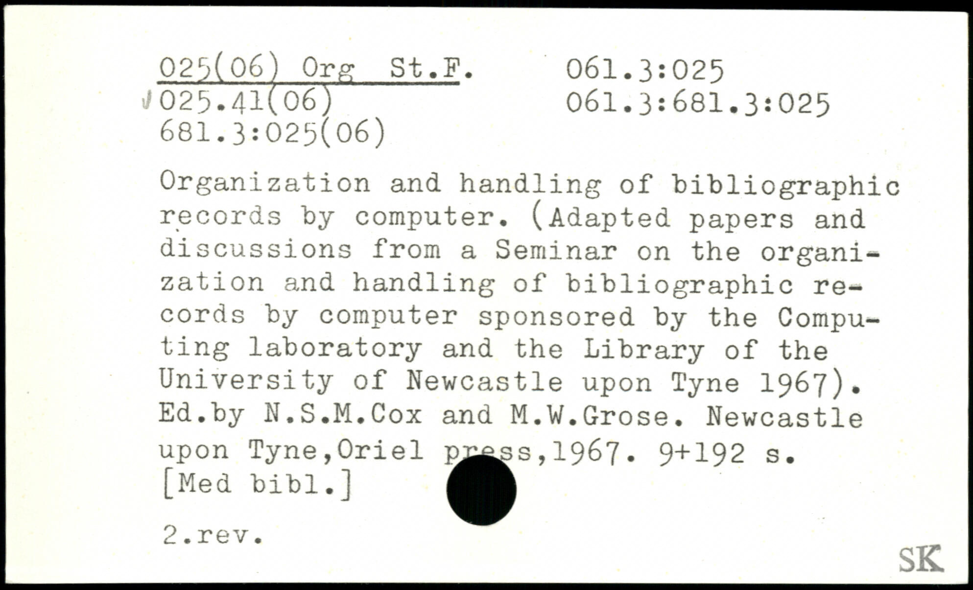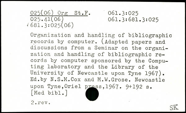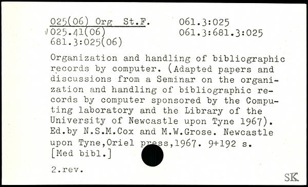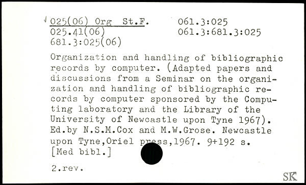 Organization and handling of bibliographic records by computer. (Adapted papers and discussions from a Seminar on the organization and handling of bibliographic records by computer sponsored by the Computing laboratory and the Library of the University of Newcastle upon Tyne 1967). Ed.by N.S.M.Cox and M.W.Grose. Newcastle upon Tyne,Oriel w^ss,1967.