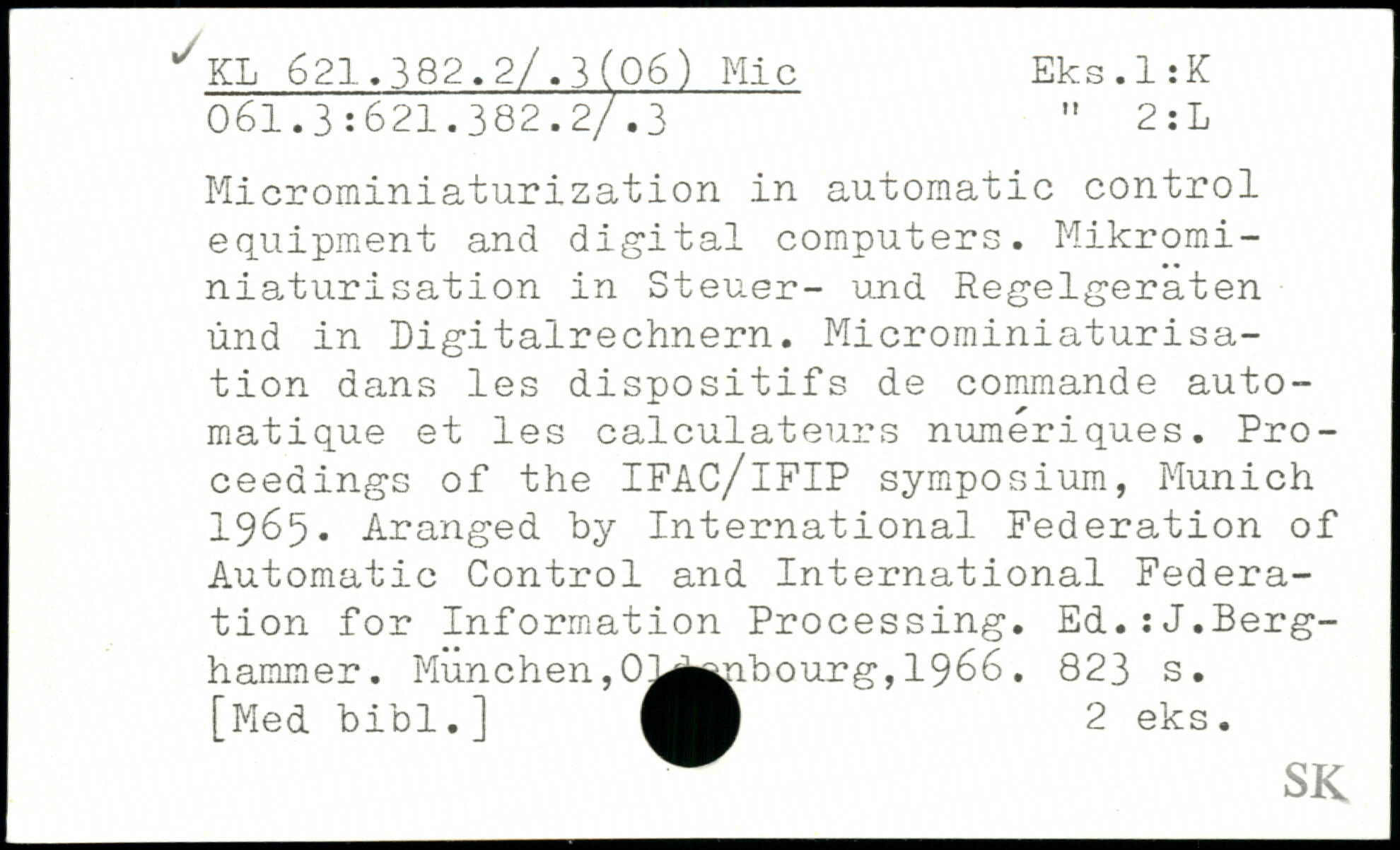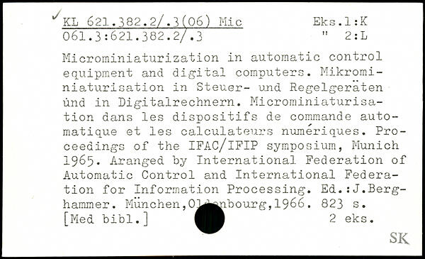 Microminiaturization in automatic control equipment and digital computers. Microminiaturisation in Steuer- und Regelgeraten und in Digitalrechnern. Microminiaturisation dans les dispositifs de commande automatique et les calculateurs numériques. Proceedings of the IFAC/lFIP symposium, Munich 1965. Aranged by International Federation of Automatic Control and International Federation for Information Processing. Ed.:J.Berg-hammer. München,0^A^.bourg, 1966.