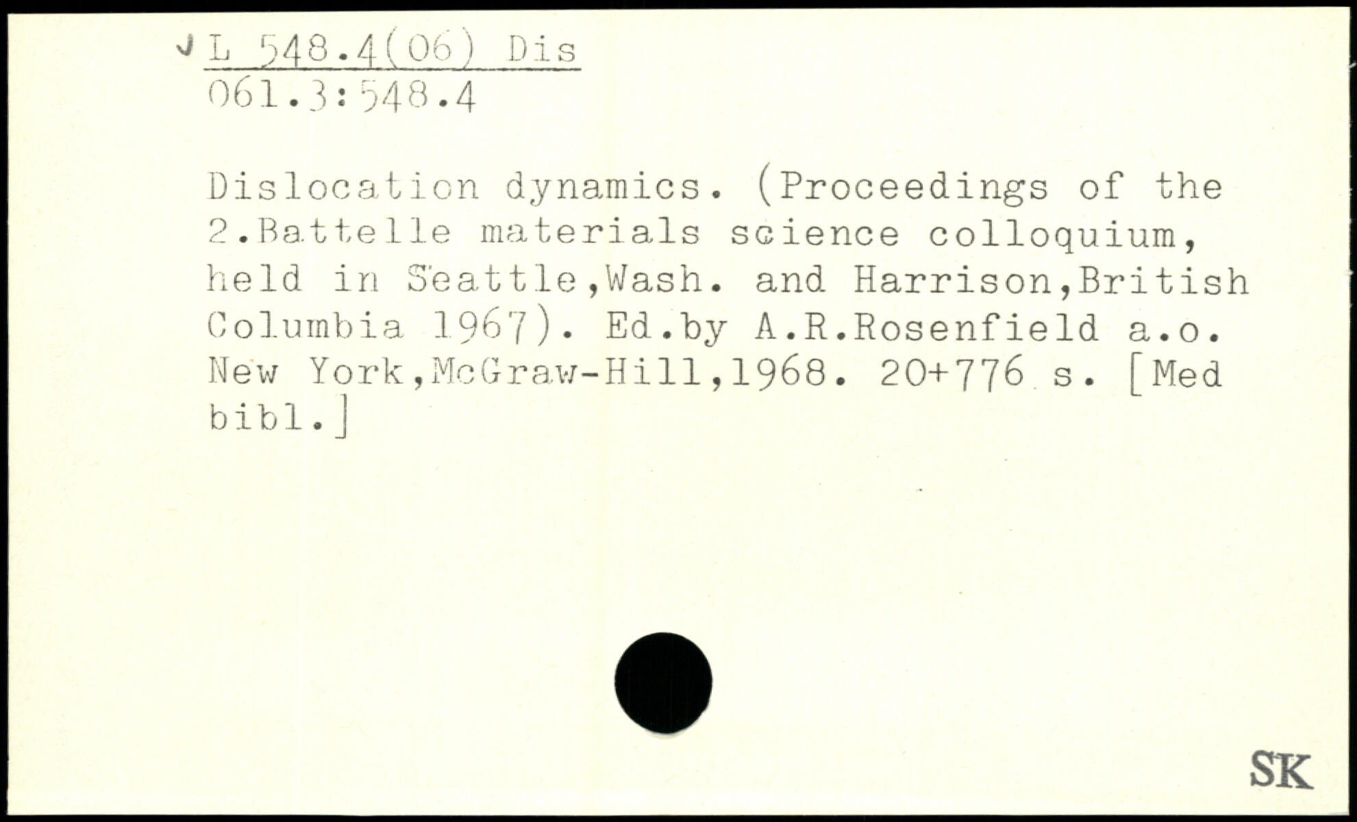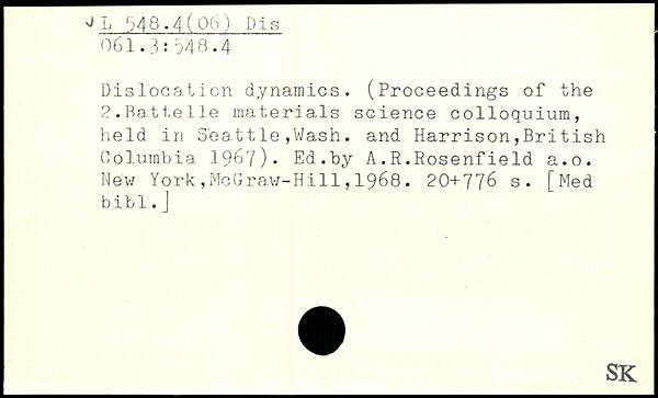 Dislocation dynamics. (Proceedings of the 2.Battelle materials science colloquium, held in Seat tie,Wash. and Harrison,British Columbia 1967). Ed.by A.R.Rosenfield a.o.