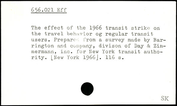 The effect of the 1966 transit strike on the travel behavior og regular transit users. Preparer; from a survey made by Barrington and company, divison of Day & Zimmermann, inc. for New York transit authority.
