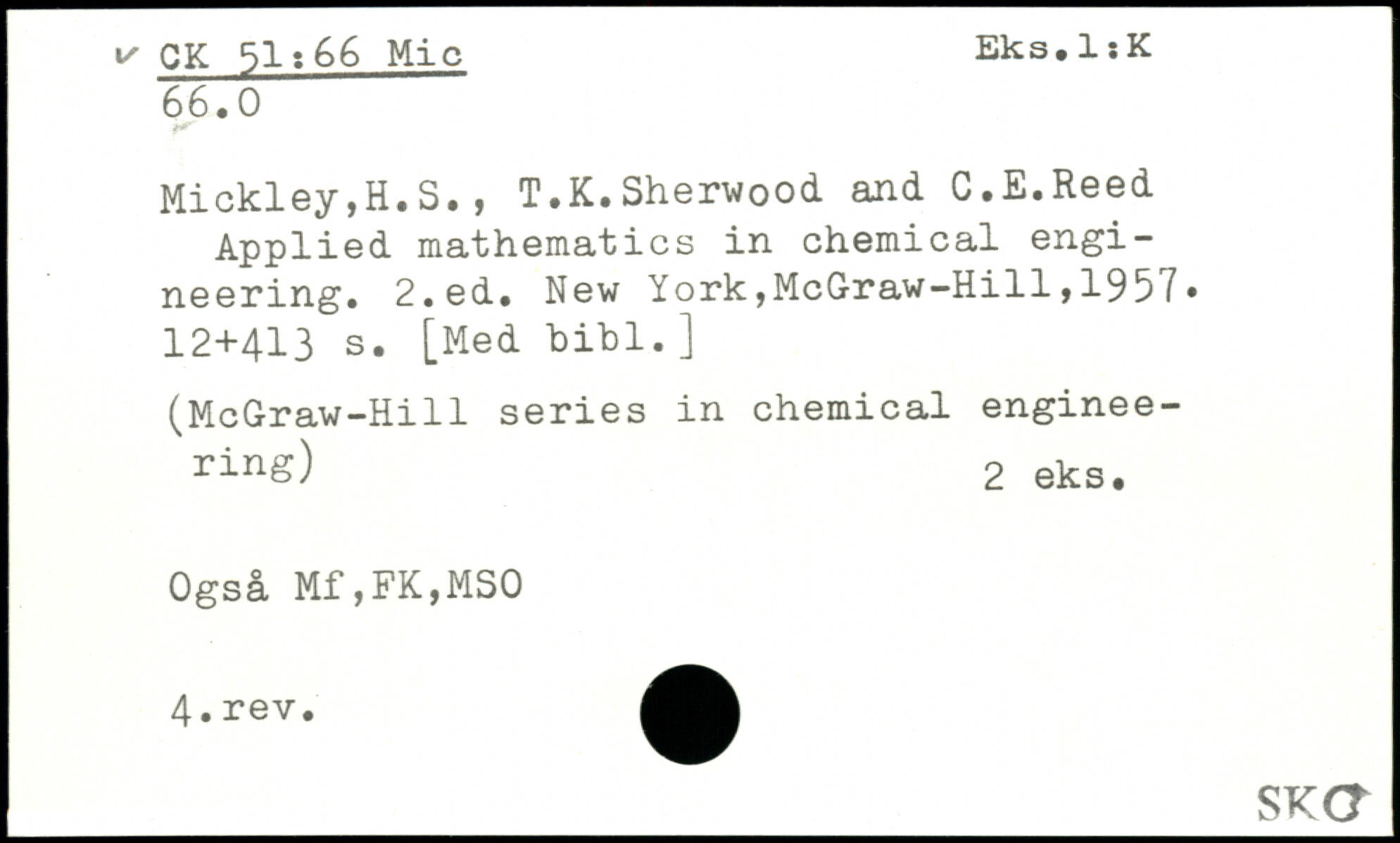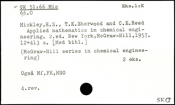 Mickley,H.S,, T.K.Sherwood, and C.E.Reed Applied mathematics in chemical engineering.