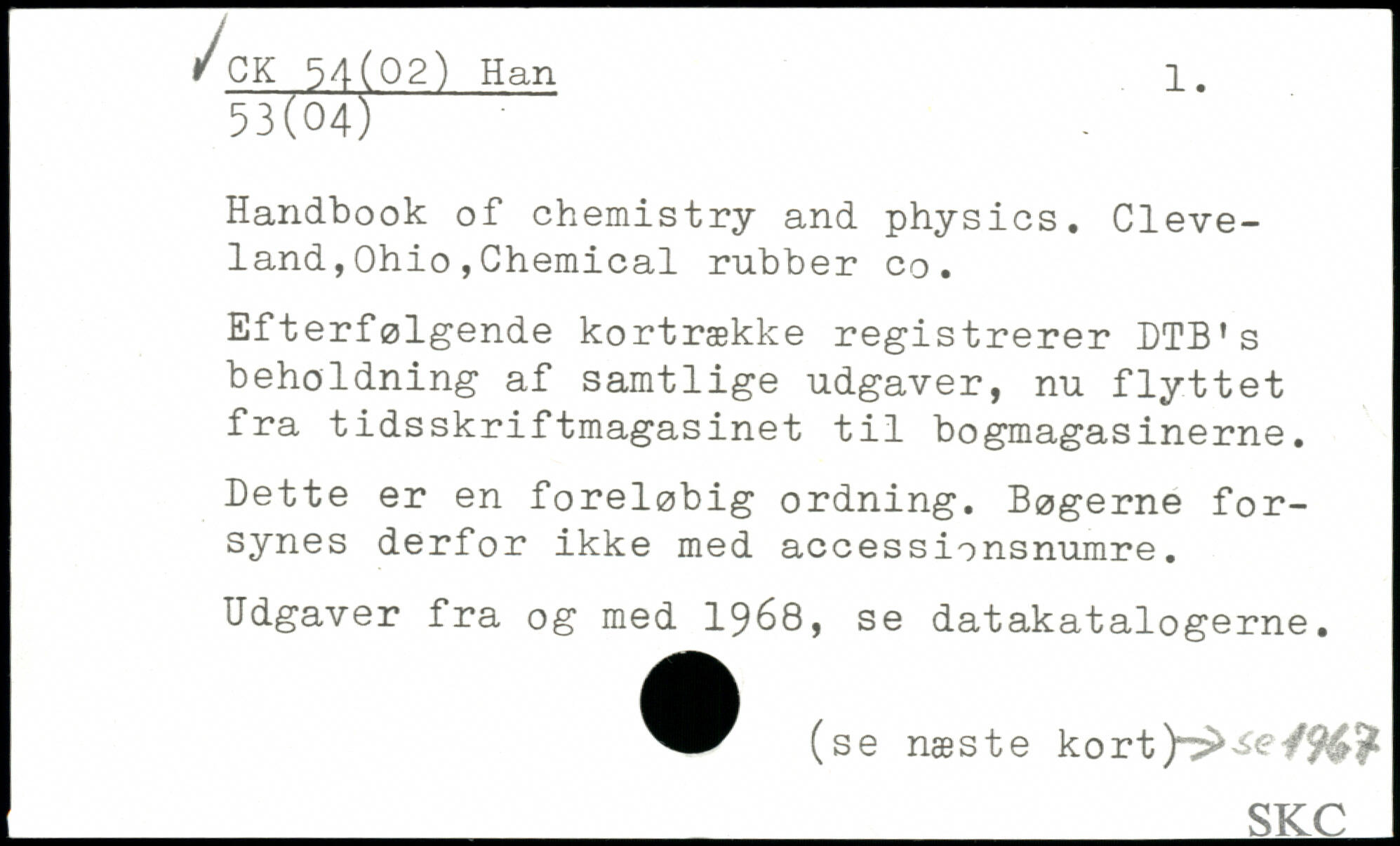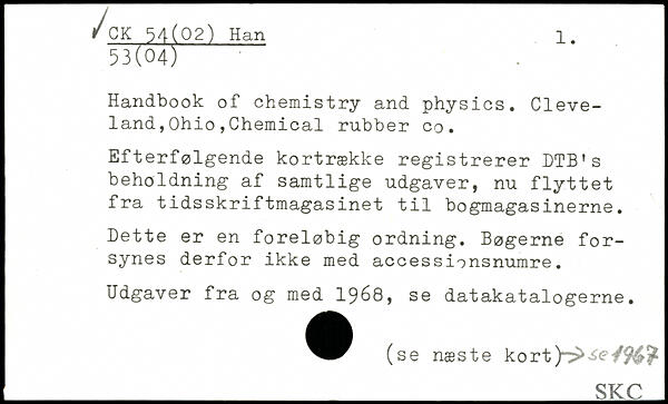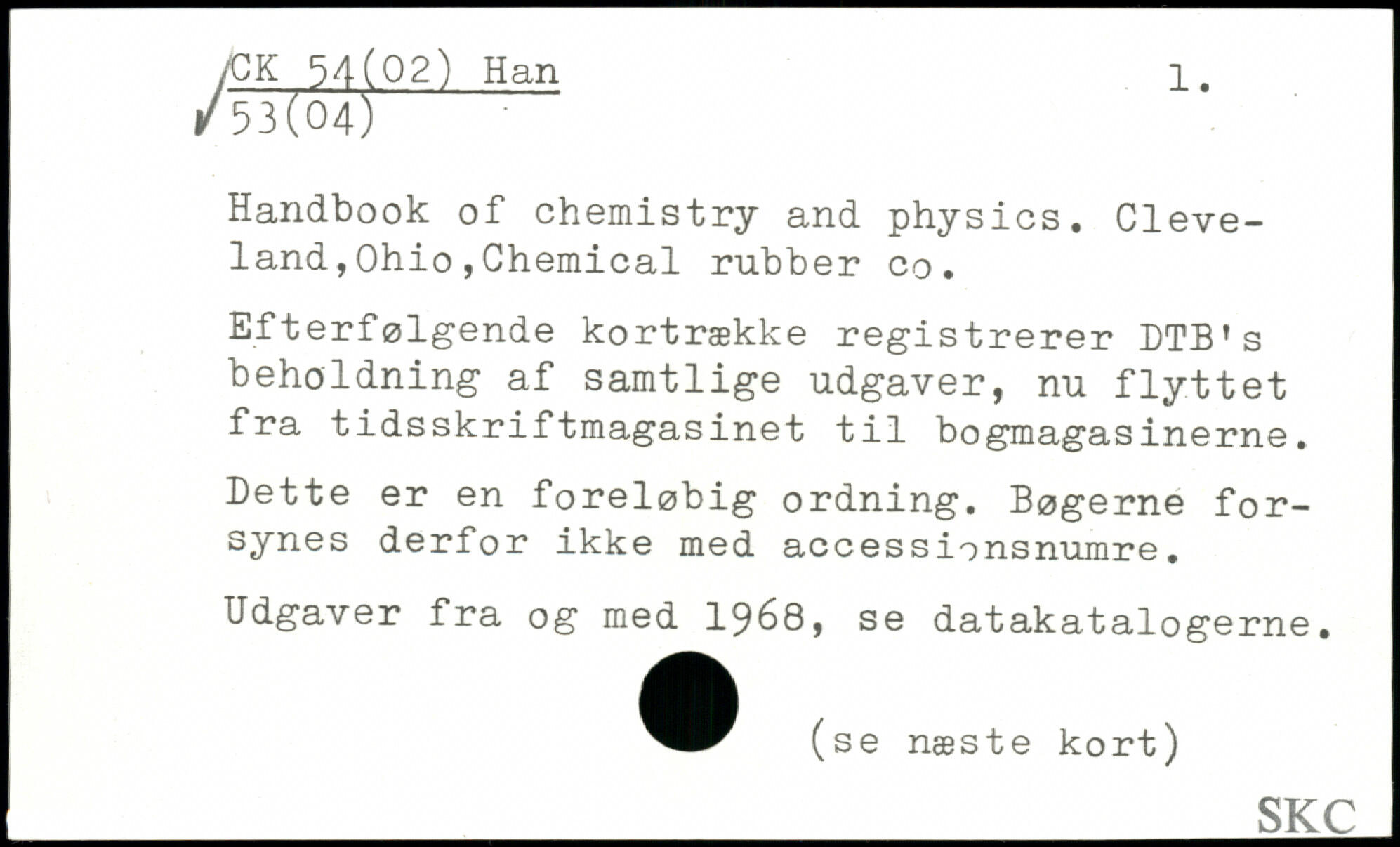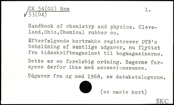 Handbook of chemistry and physics. Cleveland ,Ohio,Chemical rubber co. Efterfølgende kortrække registrerer DTB’s beholdning af samtlige udgaver, nu flyttet fra tidsskriftmagasinet til bogmagasinerne. Dette er en foreløbig ordning. Bøgerne forsynes derfor ikke med accessionsnumre. Udgaver fra og med 1968, se datakatalogerne.
