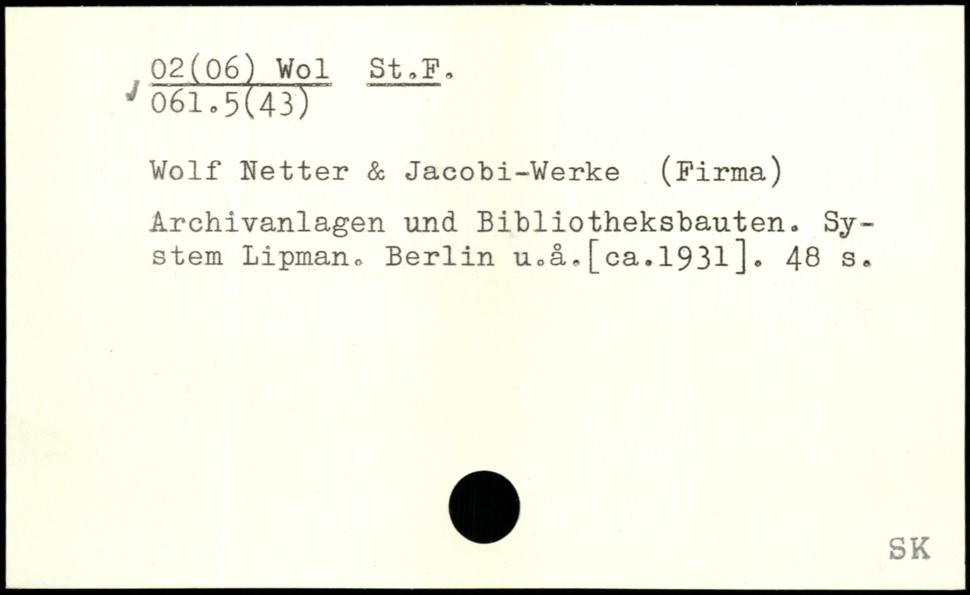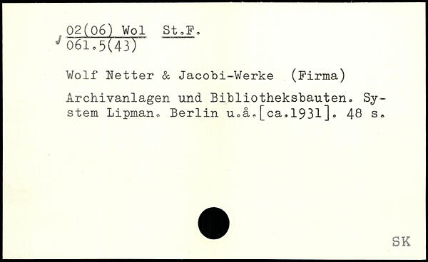Wolf Netter & Jacobi-Werke (Firma) Archivanlagen und Bibliotheksbauten. System Lipman. Berlin u.å,[ca.1931].