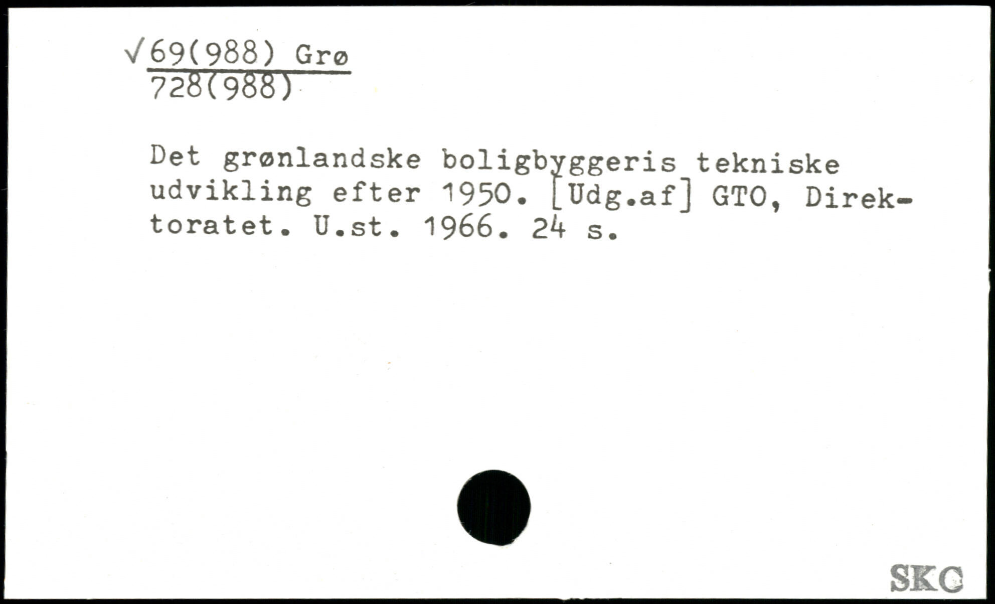 Det grønlandske boligbyggeris tekniske udvikling efter 1950. [Udg.af] GTO, Direktoratet. U.st. 1966. 2 b s.