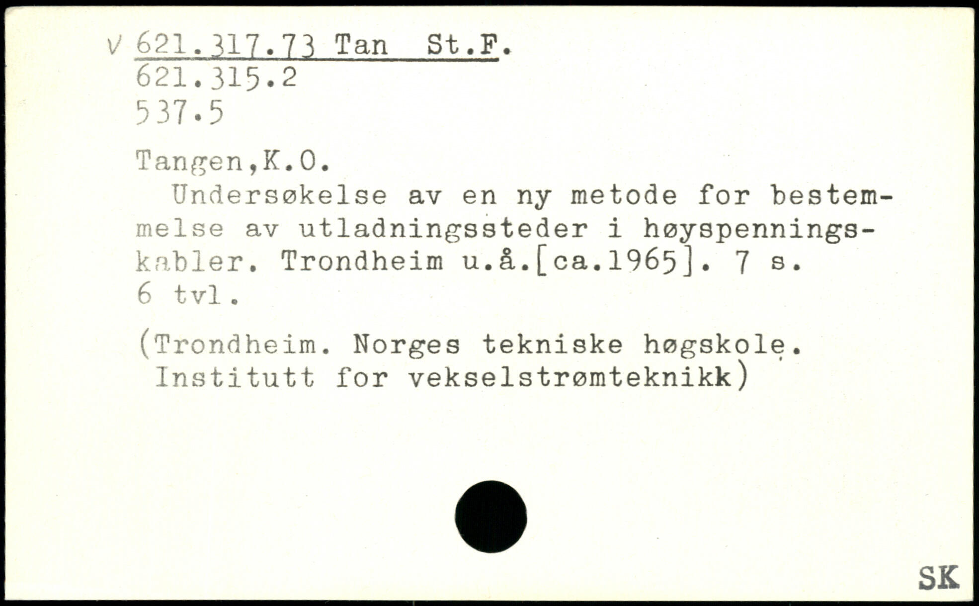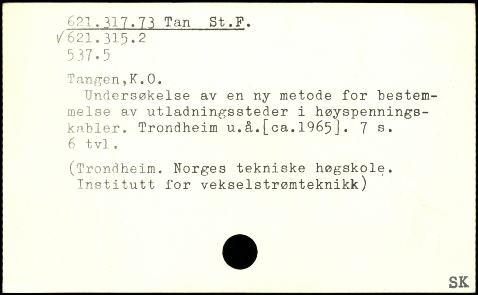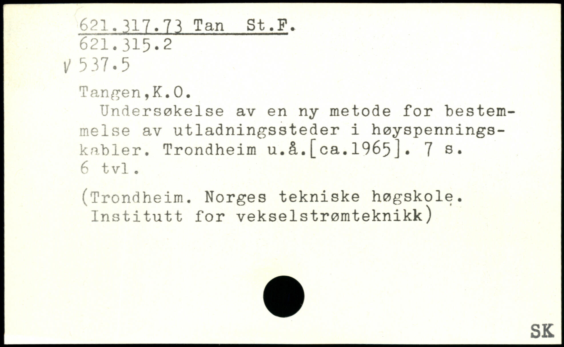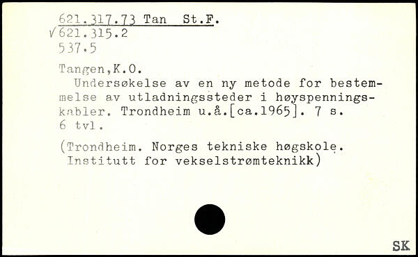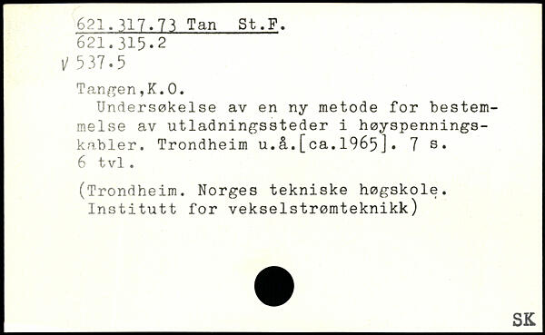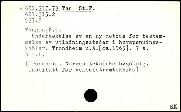 Undersøkelse av en ny metode for bestemmelse av utladningssteder i høyspennings-kabler. Trondheim u.å.[ca.1965].