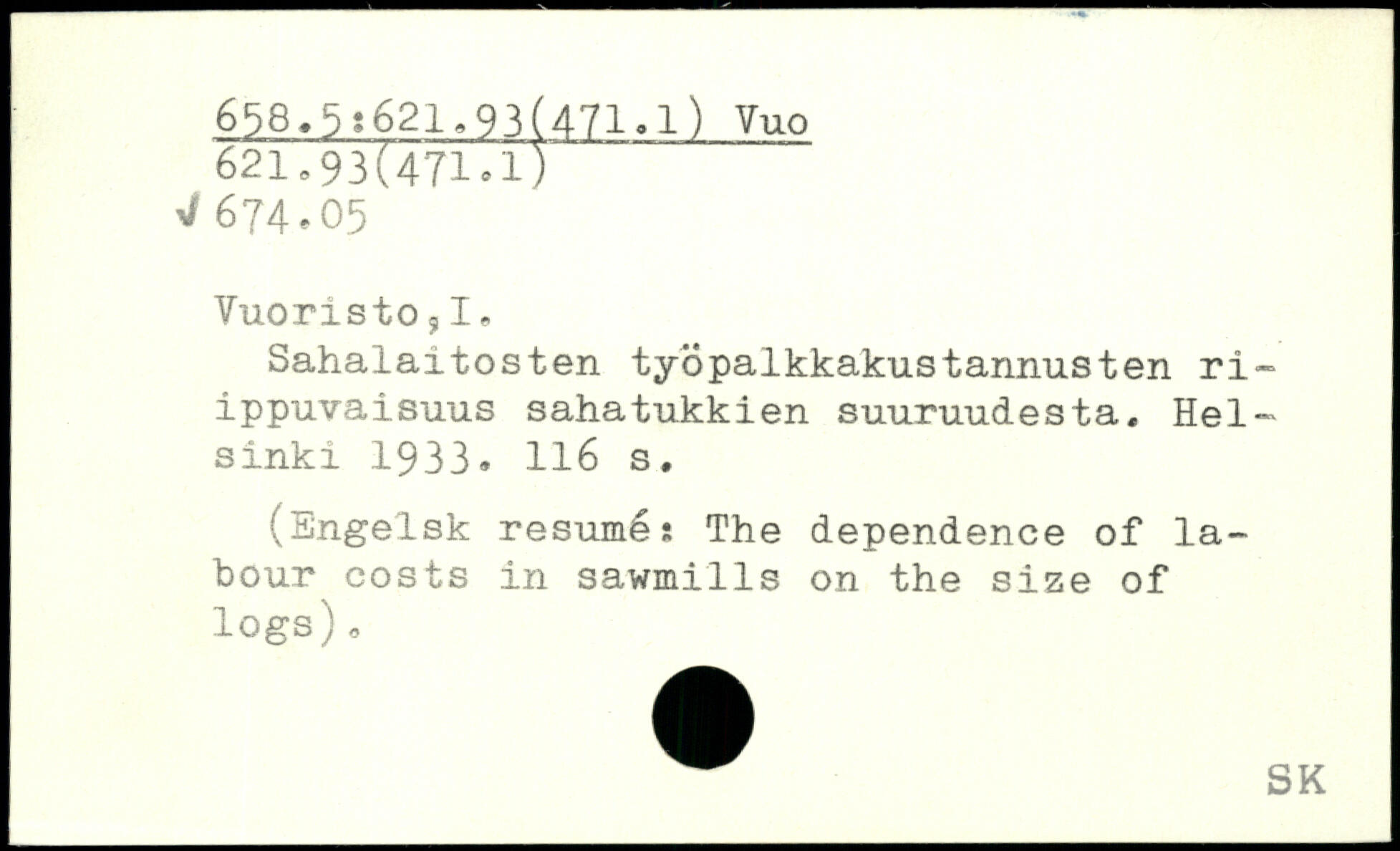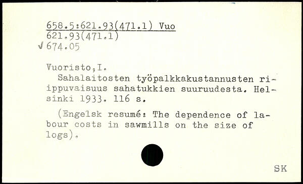 Sahalaitosten tyopalkkakustannusten ri-ippuvaisuus sahatukkien suuruudesta. Hel, sinki 1933.