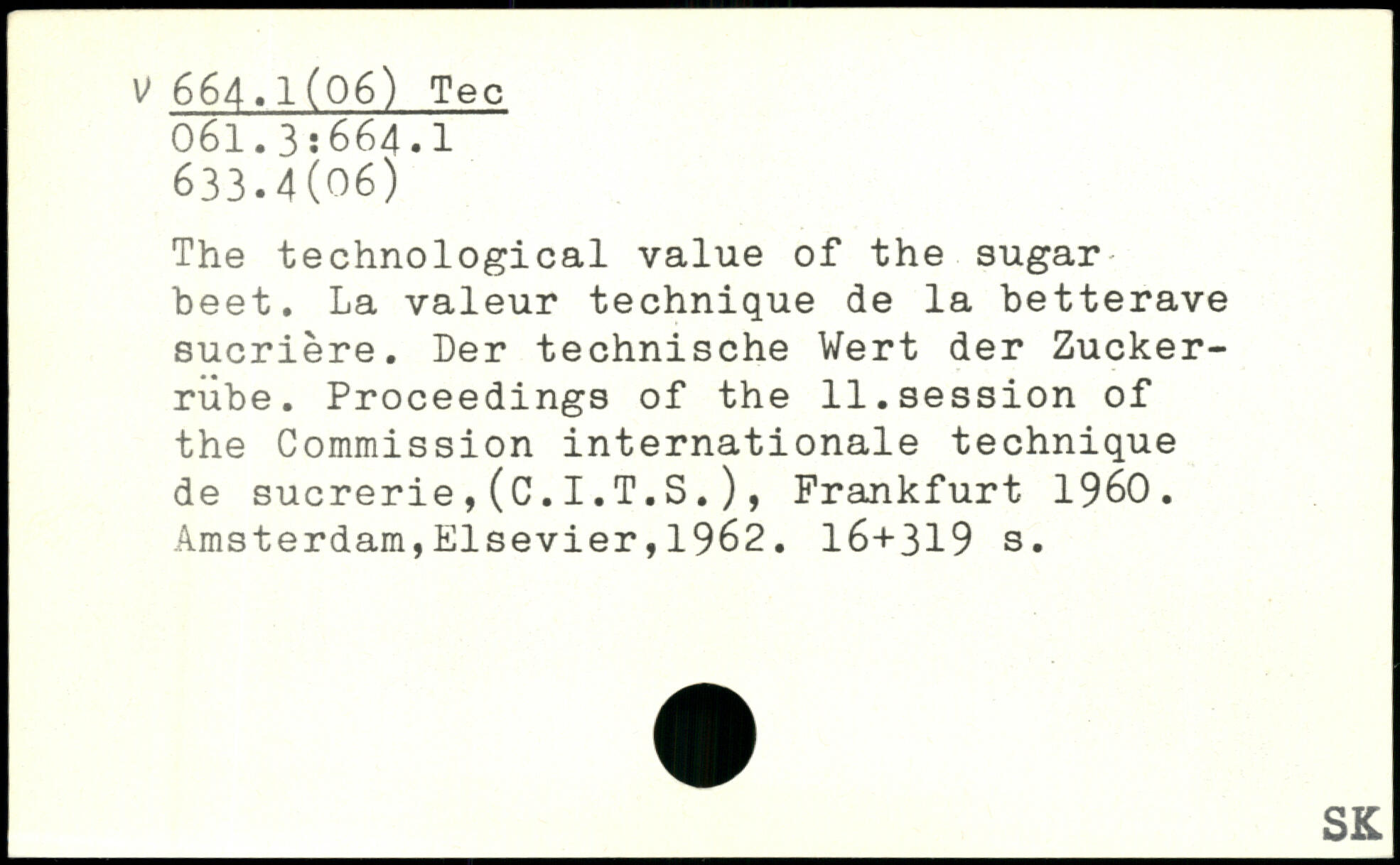The technological value of the sugar beet. La valeur technique de la betterave sucrière. Der technische Wert der Zuckerrübe. Proceedings of the 11.session of the Commission internationale technique de sucrerie,(C.I.T.S.), Frankfurt 1960.