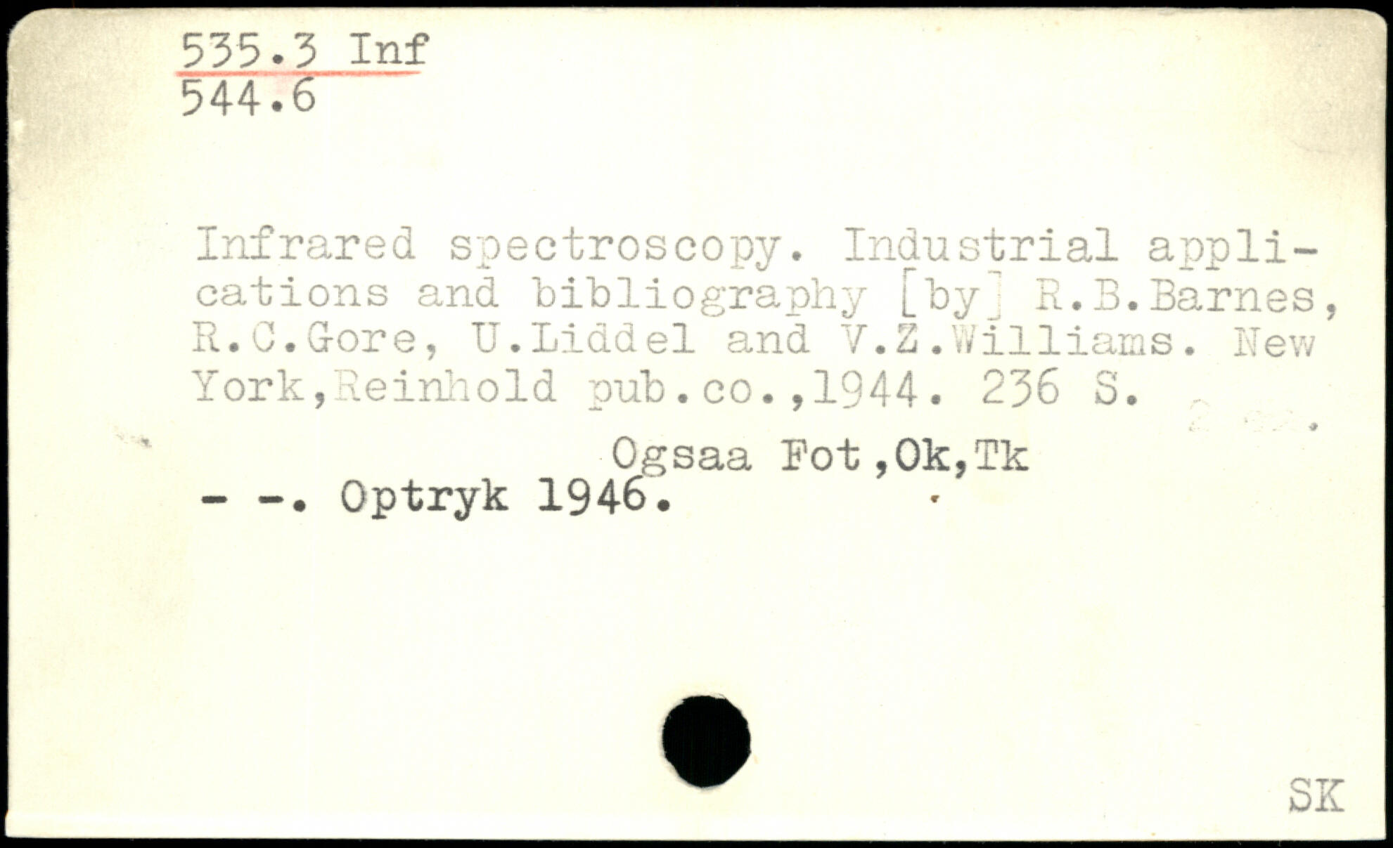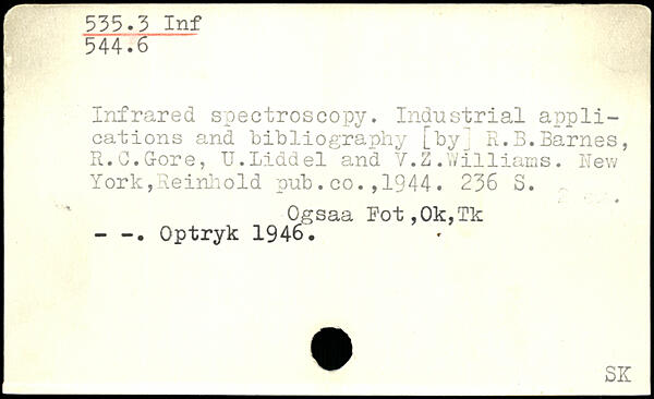 Infrared spectroscopy. Industrial applications and bibliography [by] R.B.Barnes, R.C.G-ore, U.Liddel and V.2 .W1111ams. Hew York,Reinhold pub.co1944.