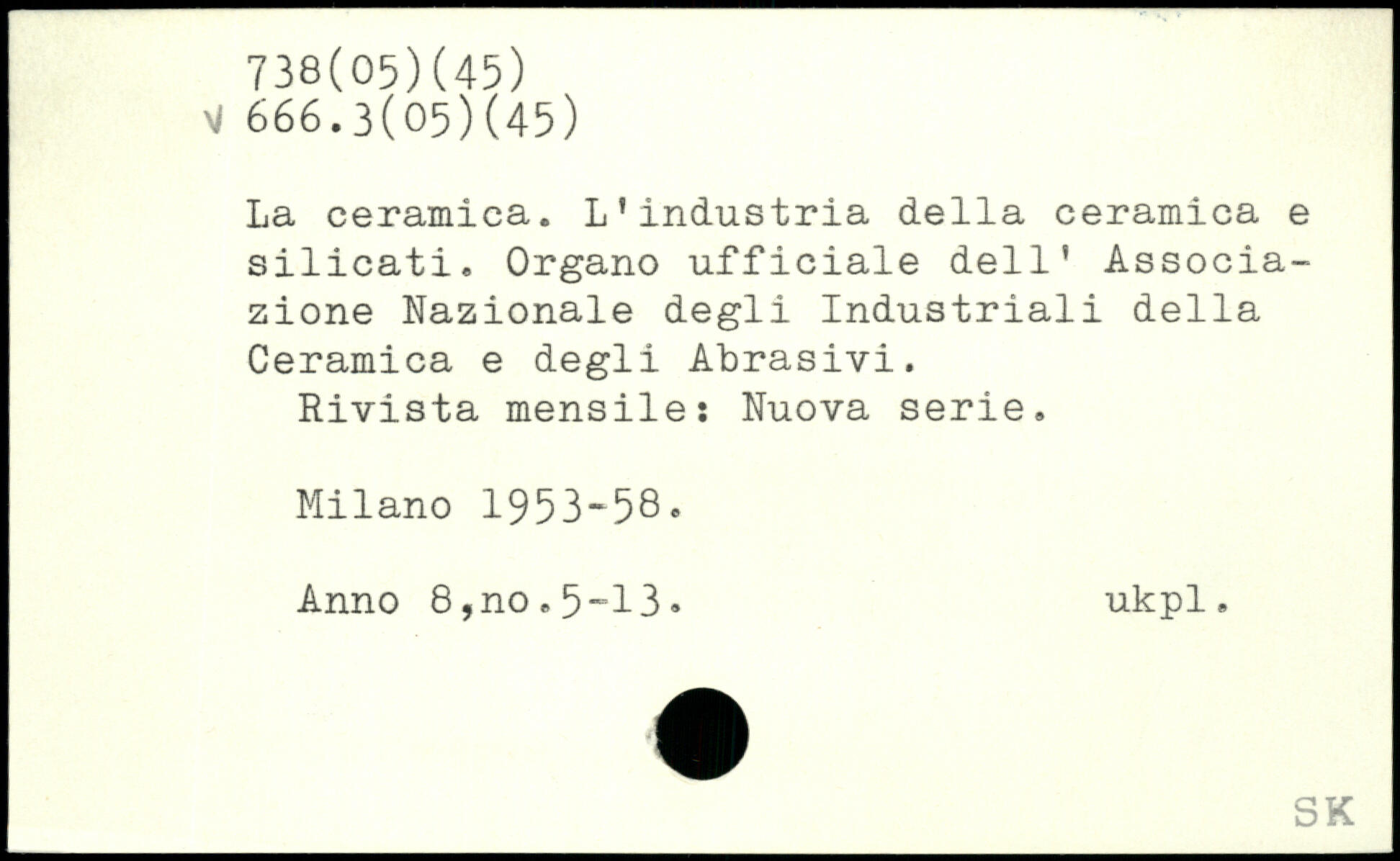 La ceramica. L'industria della ceramica e silicati. Organo ufficiale dell' Associa-zione Nazionale degli Industrial! della Ceramica e degli Abrasivi. Rivista mensile: Nuova serie. Milano 1953-58. Anno 8,no.5-13. ukpl.